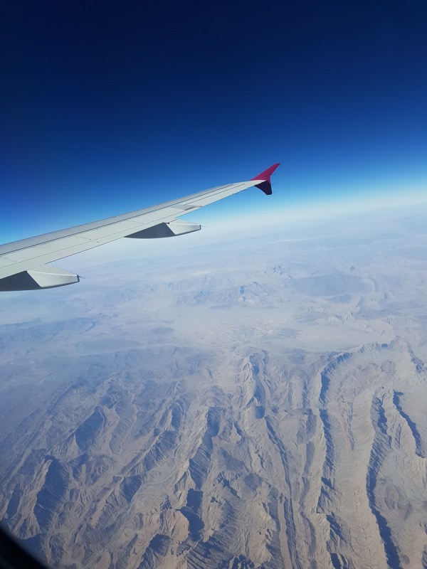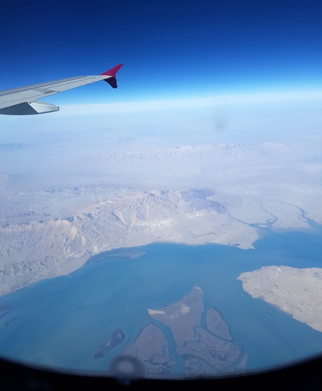В 12 часов, точно по расписанию, самолёт Катарских Авиалиний поднялся в небо над Непалом и взял курс на Доху. Видимость была отличная, и я смотрела с высоты полёта на пустынные ландшафты Пакистана, а затем и на Персидский залив. Не могла оторваться от окна, так было интересно и красиво.