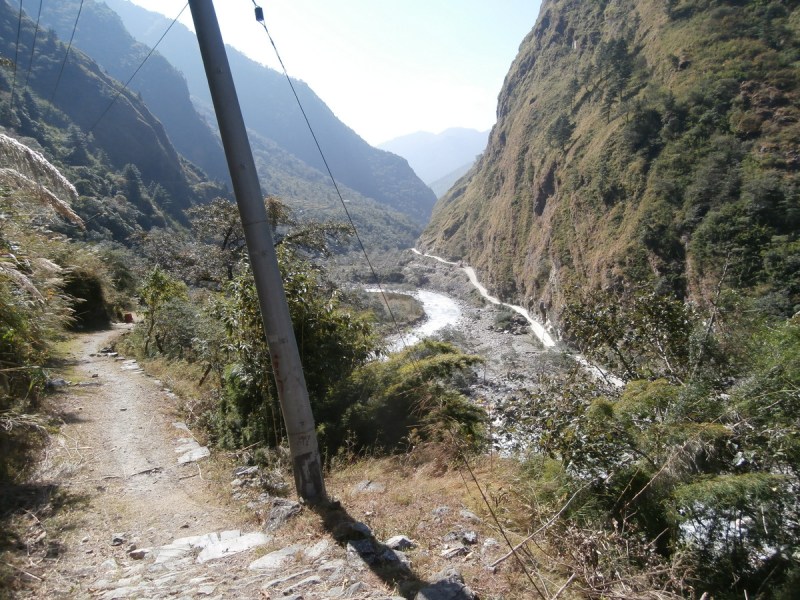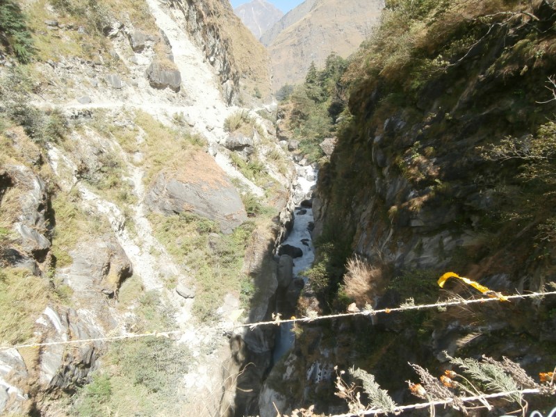 Харка, видимо, не ожидал такого поворота событий. Но я серьёзно взялась за его воспитание. Пусть знает, что решения свои нужно обсуждать с клиентом. Ему ничего не оставалось, как предложить мне вернуться назад, на треккерскую тропу. Ну что же, я, конечно, согласилась, хоть и для этого пришлось пройти весь длинный крутой склон, но теперь уже вверх. Прежде чем пойти назад, я полюбовалась с мостика на красивый узкий каньон, сквозь который протекает здесь река Кали-Гандаки.