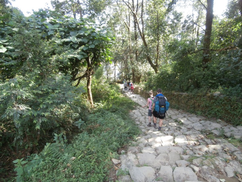 После очередной аутеничной деревеньки тропа раздвоилась: одна шла чуть вверх (влево), другая круто вниз (вправо). Ничего мне не объяснив, портер свернул на правую тропу, и мы пошли вниз. Навстречу нам попались военные в форме и с автоматами. Человек 10. Может они шли в поход, а может — тренировались на пересечённой местности. Смотрела на них с интересом.