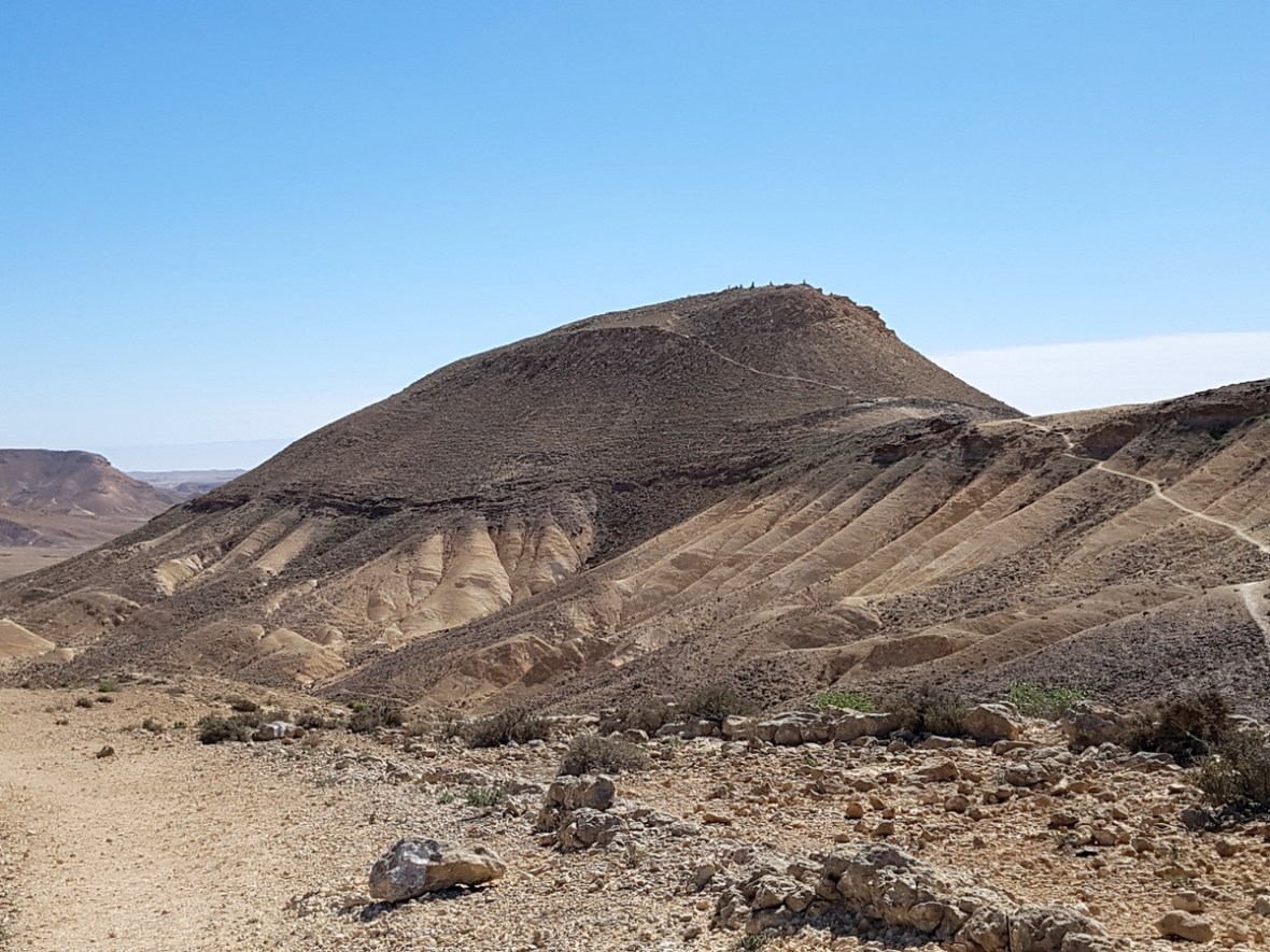 12 марта, 2018 • 1200 × 900 • Махтеш Рамон, западная часть. Первозданная природа и цветение ривасим. Уходим по красной тропе вниз. Взгляд назад, на гору Идо (с севера).