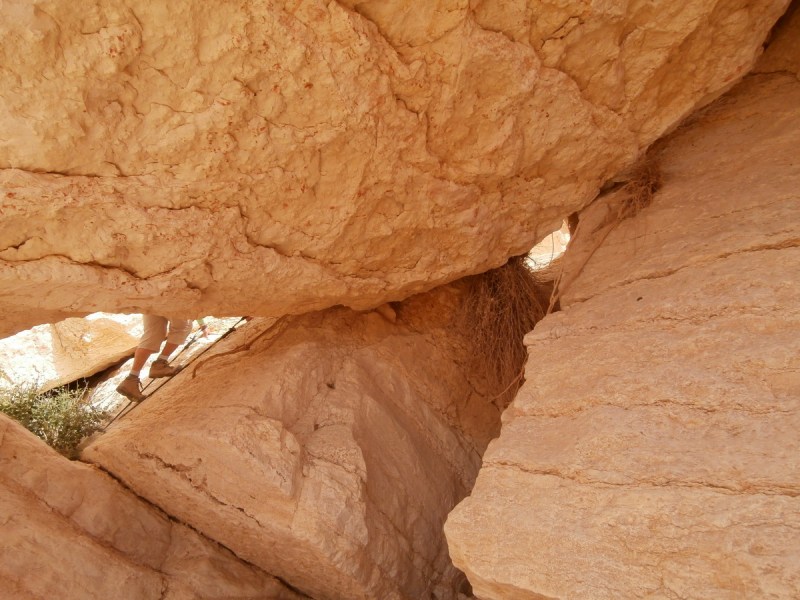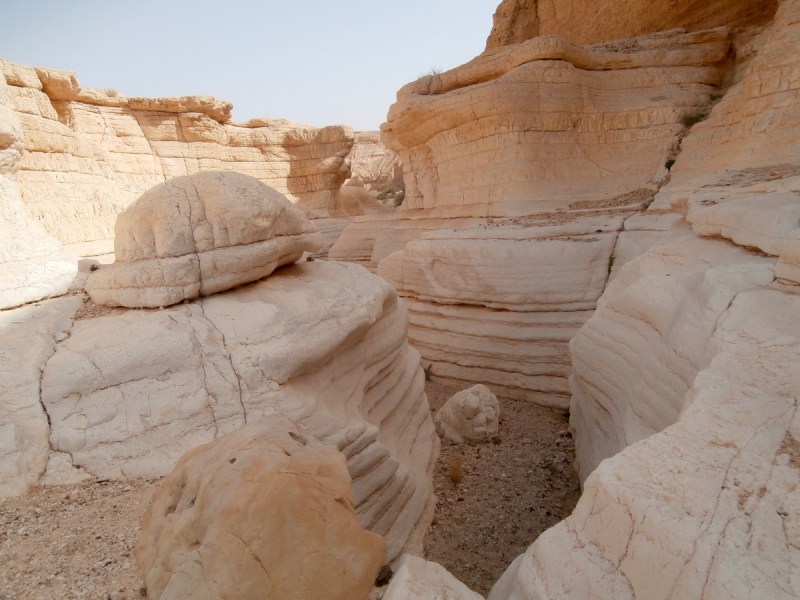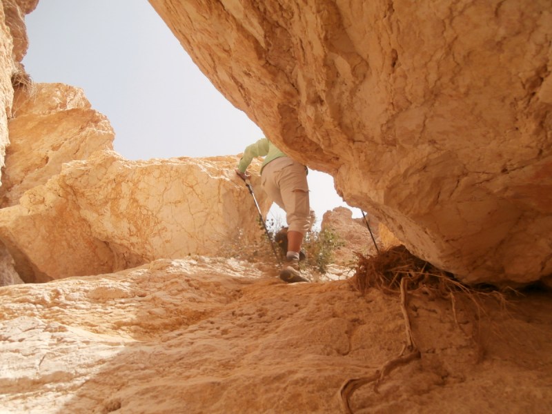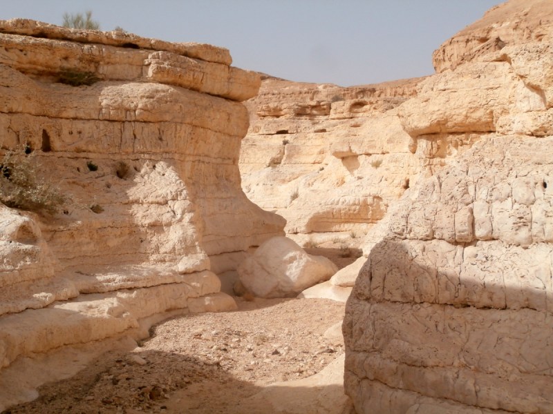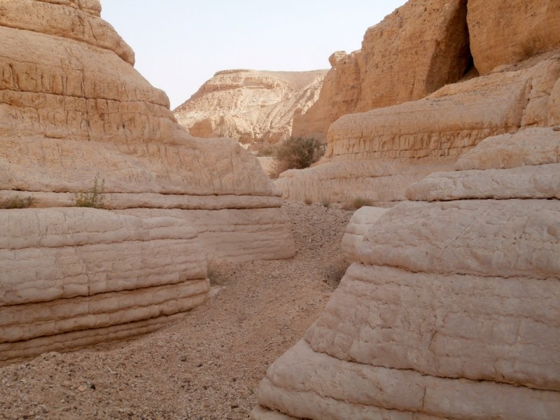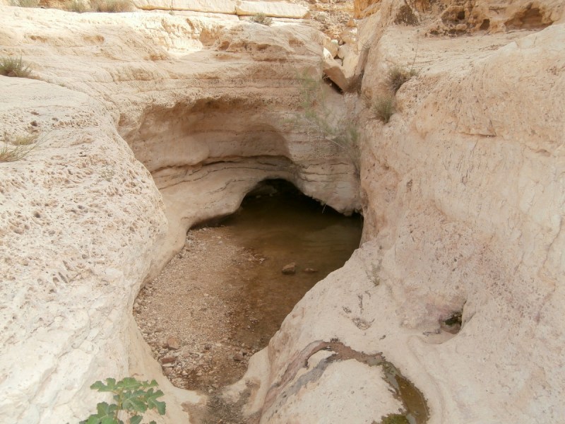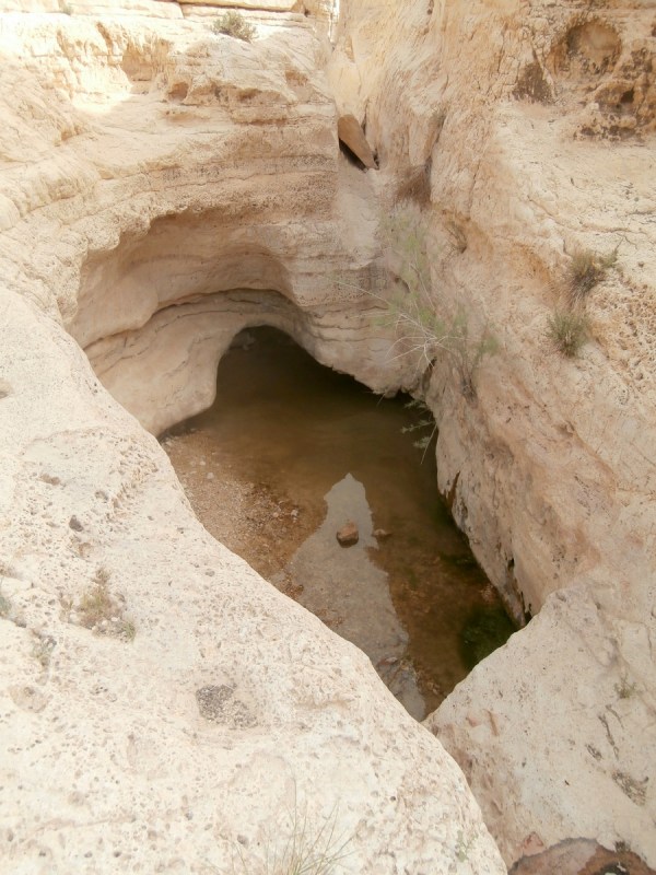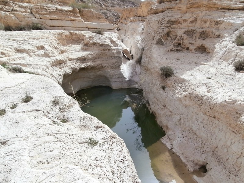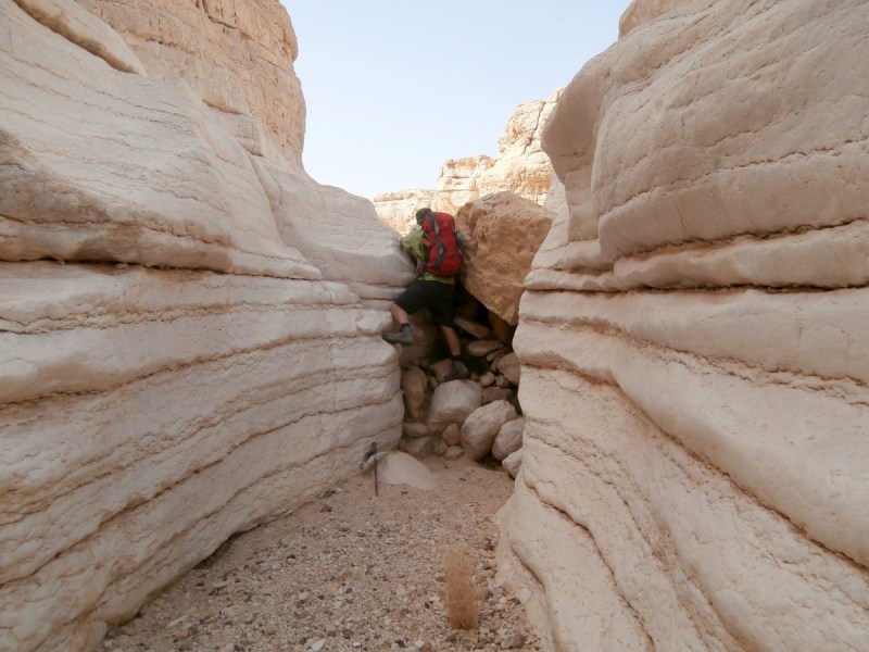 Прошли развилку нахалим Хава и Дарас+Тараф и вскоре попали в каньон потрясающей красоты. Стены каньона сложены из белого известняка (эвен гир). Каньон просто завораживает, хочется смотреть без конца на его изгибы и белые скалы. Вода здесь бывает после шитфонот. Сейчас воды не было, и это облегчило прохождение каньона.