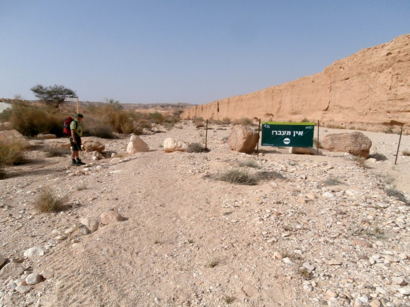 Пошли по синей джиповке и на перекрёстке, через 1 километр, повернули налево на нахаль Хава, на красную джиповку. По ней прошли ещё 2 километра и оказались в точке, где джиповка уходит налево, а в русле нахаля Хава стоит щит, гласящий, что вход в нахаль запрещён. Возможно, он запрещён только для джипов, и человек, входящий туда, не совершает никакого преступления. Этого я не знала. Но я знала наверняка, что надо как можно быстрее, пока здесь не начали ездить пакахим, уйти в глубь нахаля, туда, где нас не видно с джиповки. Скорее всего, паках не пойдёт пешком по тропе искать нарушителей, обычно они ездят на джипах.