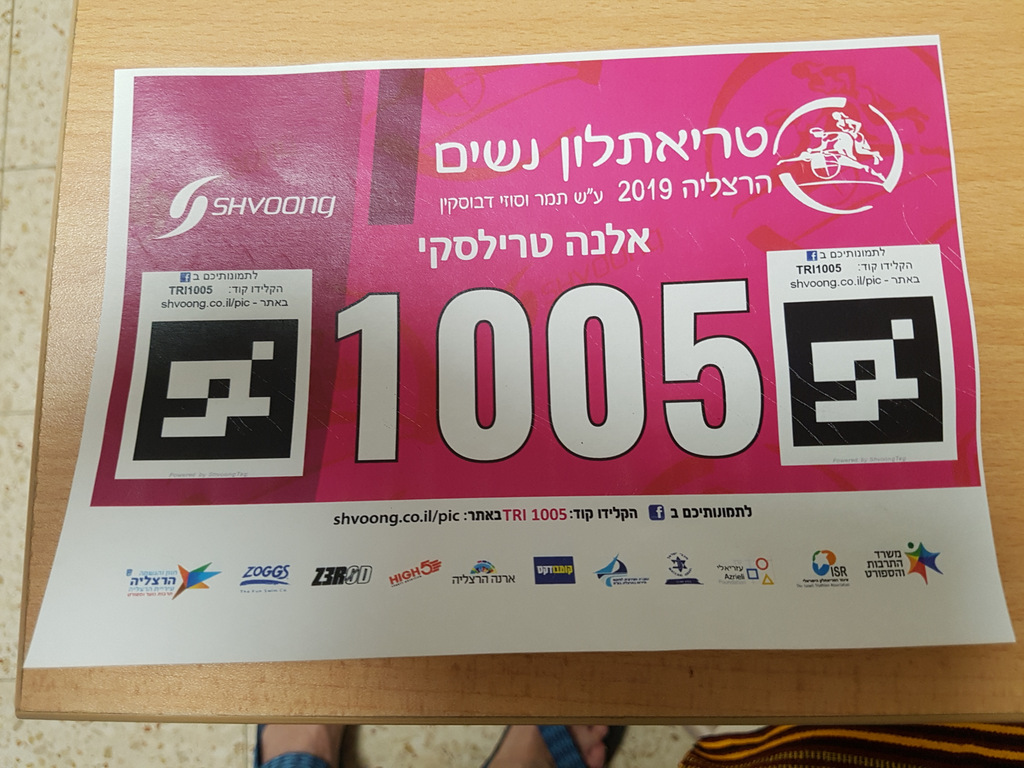 За день до соревнования я поехала в каньон Арена в Герцлии и получила снаряжение для соревнования, которое включало чип (чтобы записывать время), личный номер, номер для велосипеда, резинки и булавки для крепления номера майку, шапочку для плавания и маленькие подарочки. В принципе, этого хватает, но нужно ещё чёрную тушь, чтобы написать номер на руках и ногах, как того требуют. За пользование чипом берут залог 50 шекелей, который возвращают на финише (не забыть забрать).