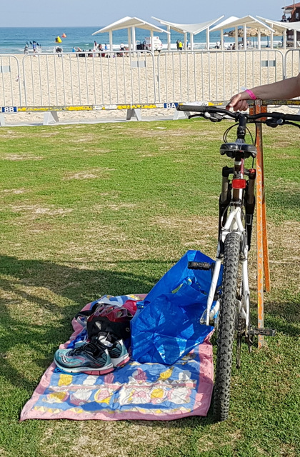 Я прошла в шетах ахлафа, места там было предостаточно. Я заняла себе уголок, поставила велосипед к железной стойке и разложила на полотенце вещи в определённом порядке так, чтобы после плавания побыстрее одеться и обуться, и быть готовой к гонке на велосипеде. Нужно положить номер с резинкой, а также бутылку с водой и полотенце, чтобы помыть ноги перед обуванием кроссовок. Кроме этого, там должна лежать каска, майка, тайцы, кроссовки и носки. Вода для питья тоже необходима.