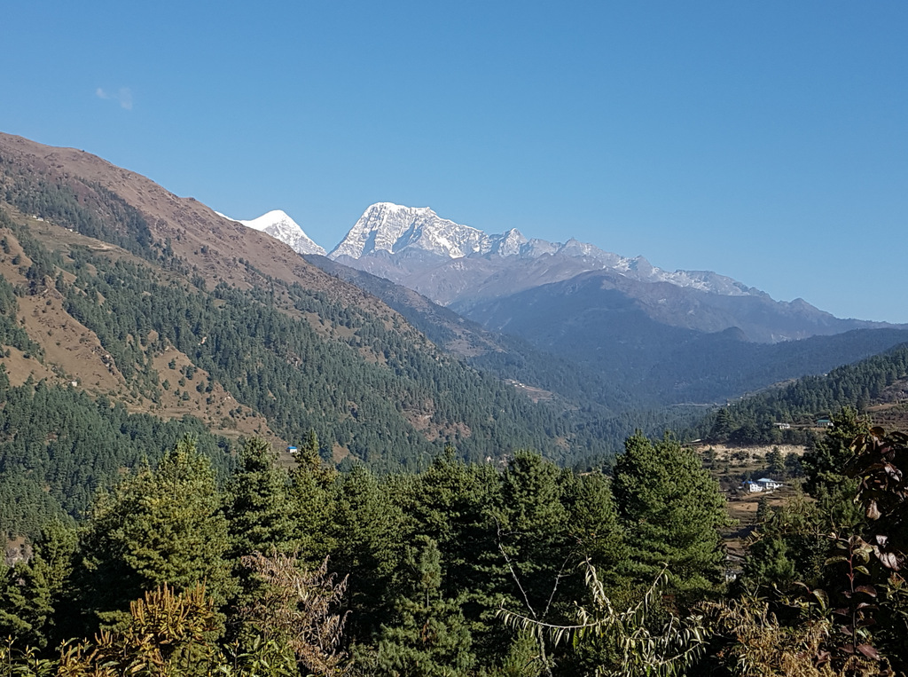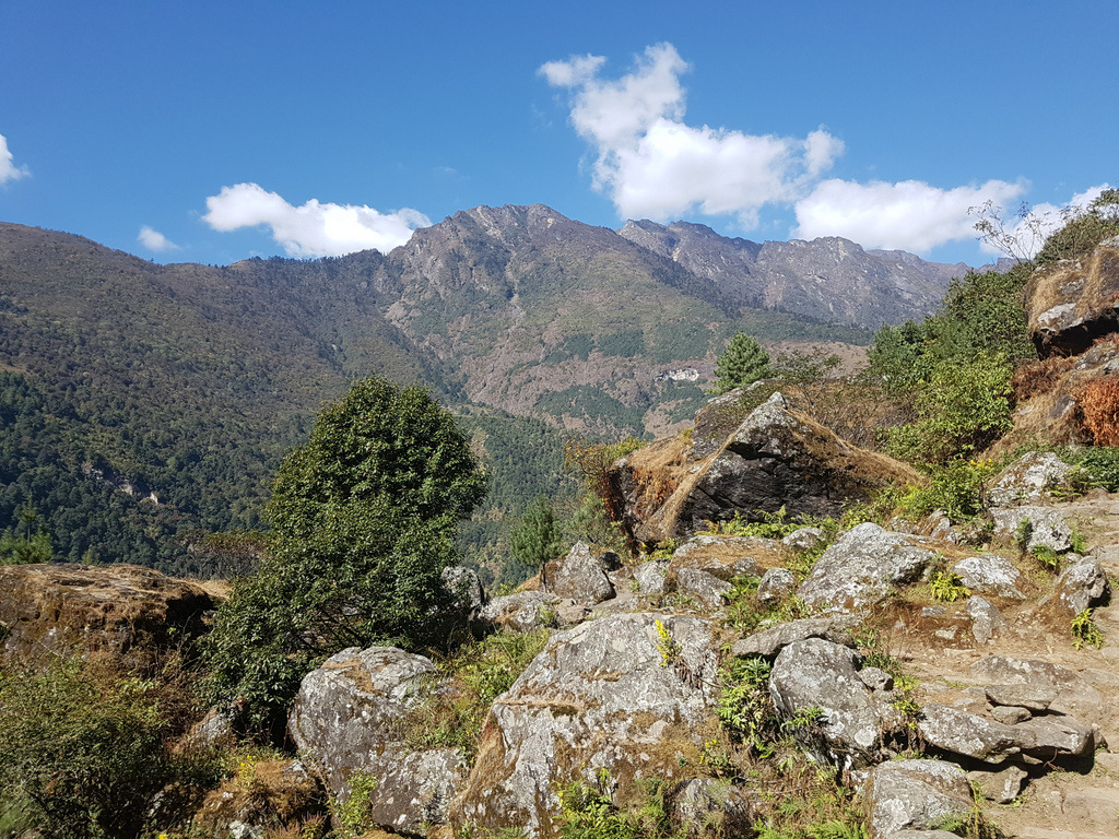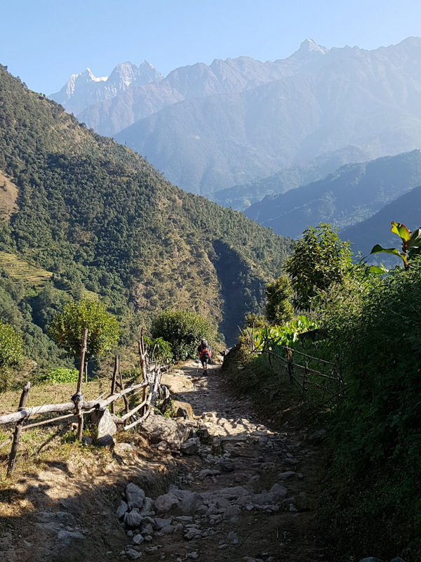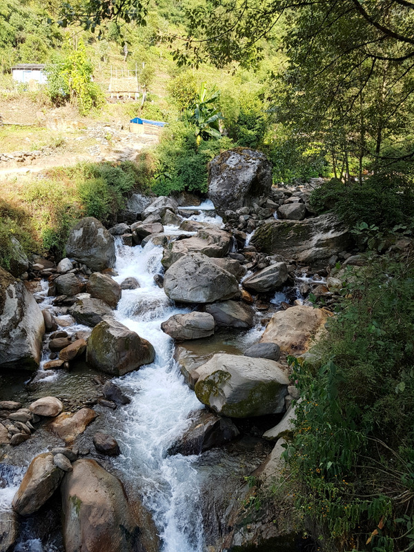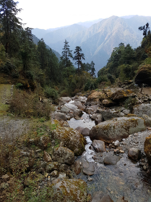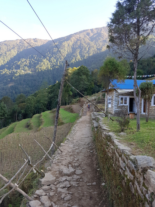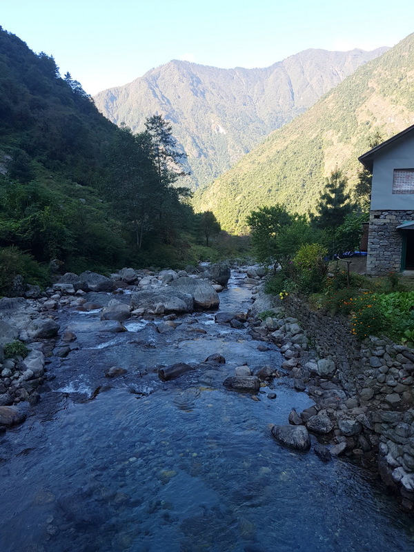 В 6:45 вышли в путь. Сразу за Пхакдингом перешли на правый берег реки и шли по нему довольно долго. Любовались видами вокруг — горами, рекой. Проходили разные деревни. Были и спуски, и подъёмы, но незначительные. Хотя в целом мы поднимались вверх, и это понятно, это — наша цель.