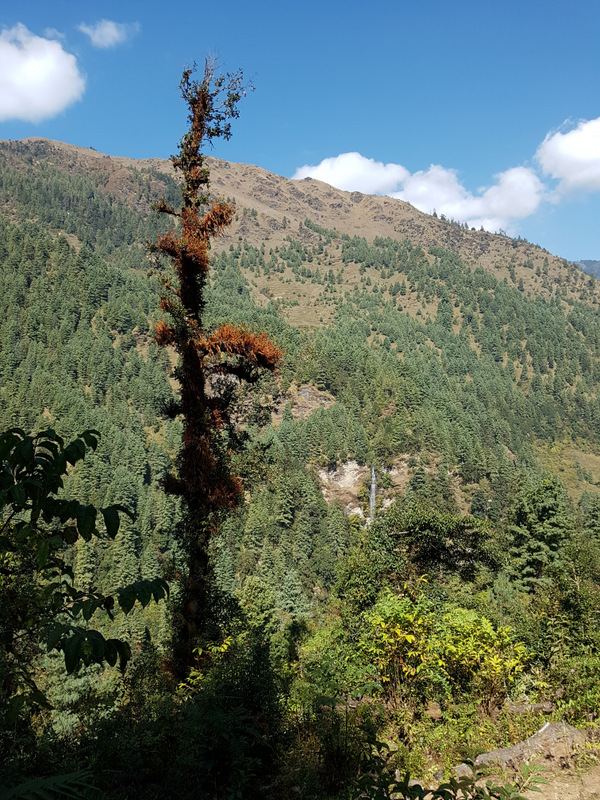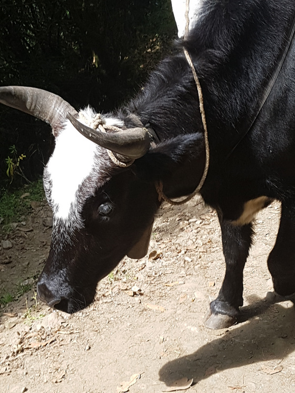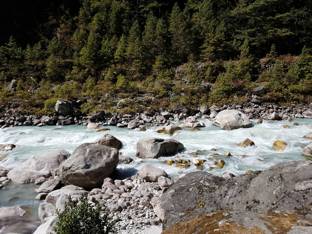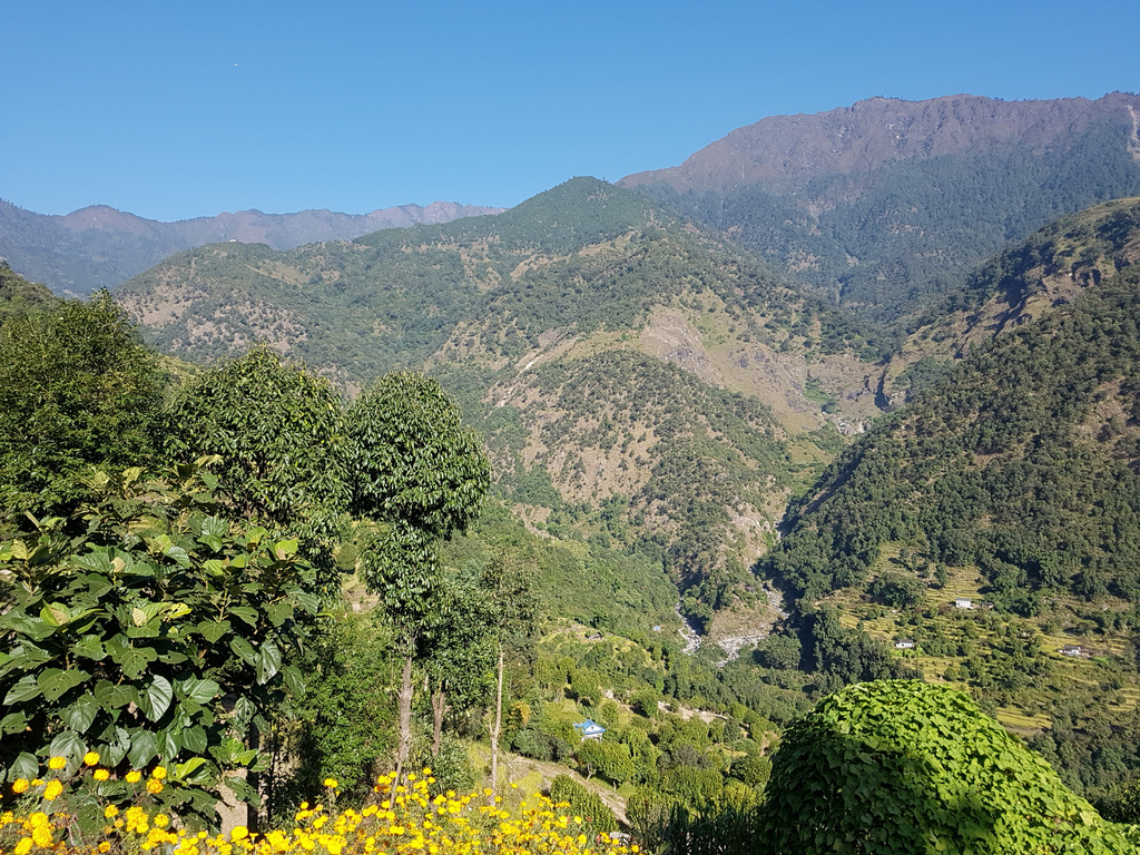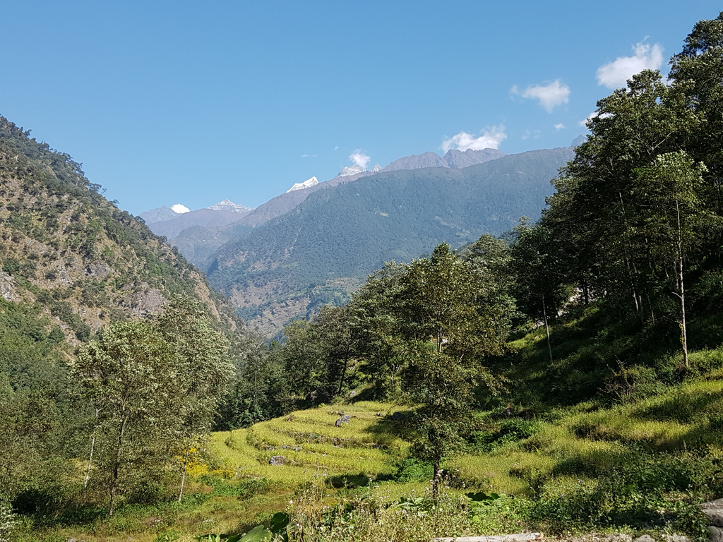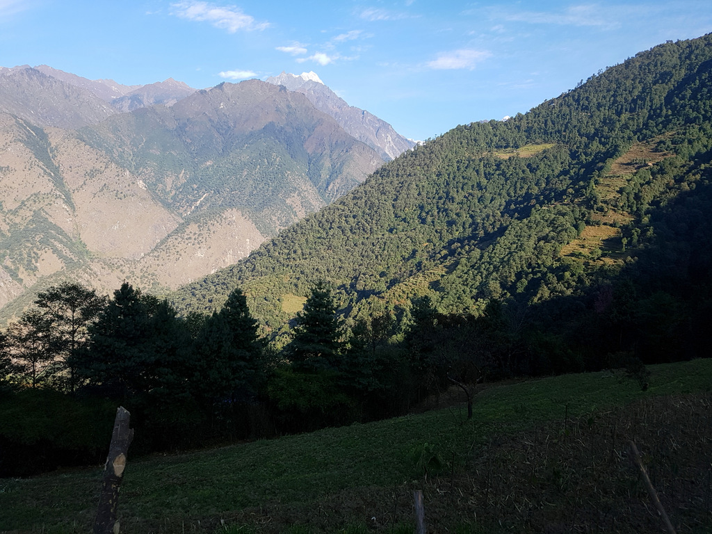 В 6:45 вышли в путь. Сразу за Пхакдингом перешли на правый берег реки и шли по нему довольно долго. Любовались видами вокруг — горами, рекой. Проходили разные деревни. Были и спуски, и подъёмы, но незначительные. Хотя в целом мы поднимались вверх, и это понятно, это — наша цель.