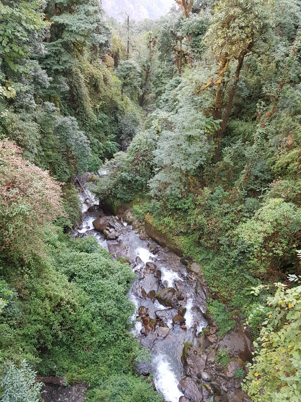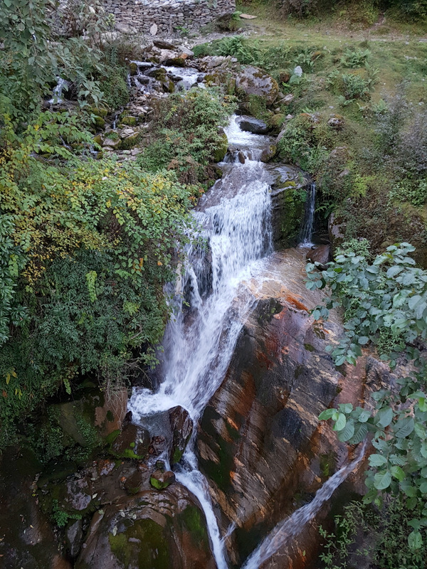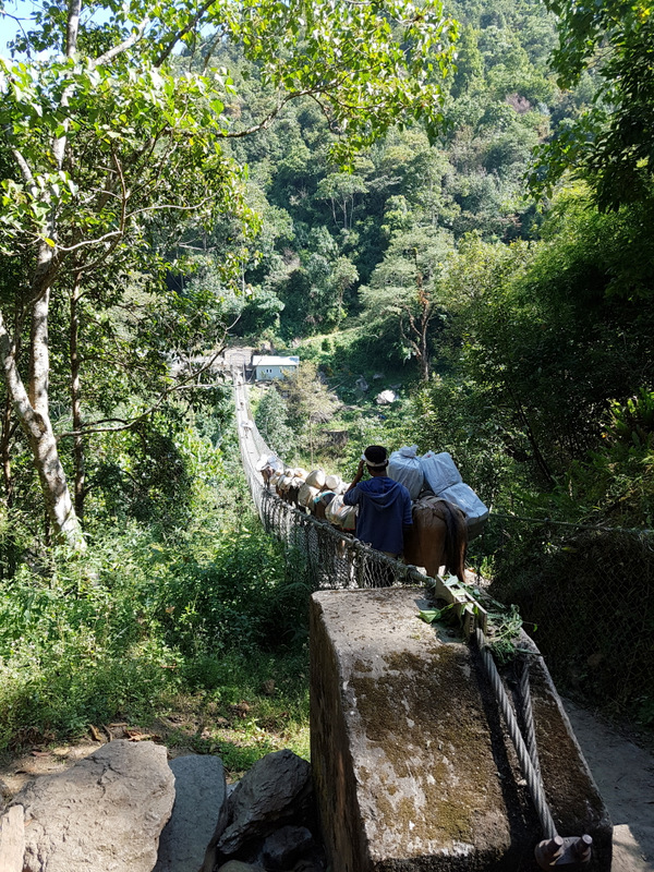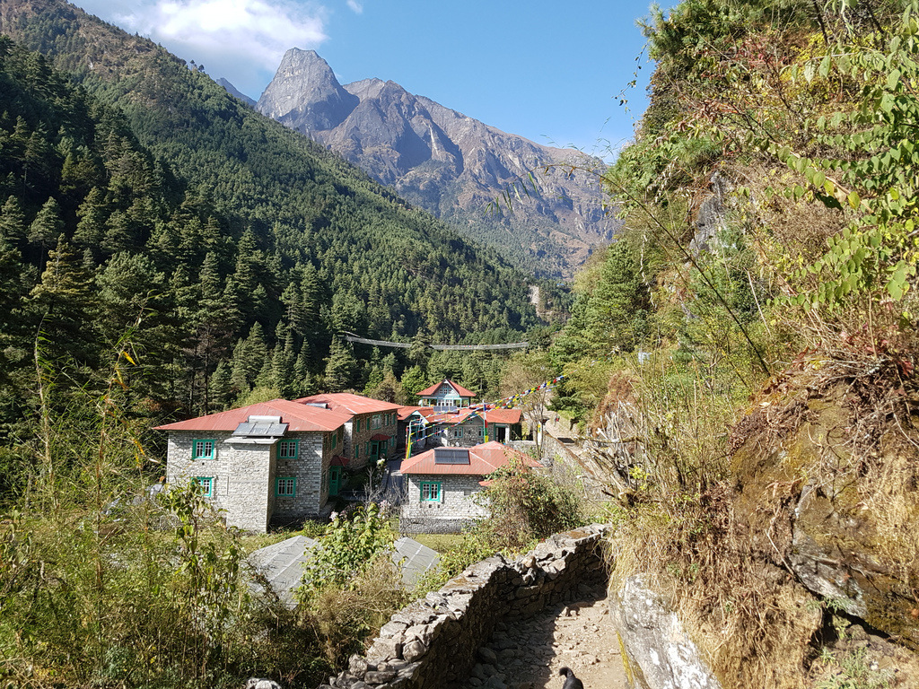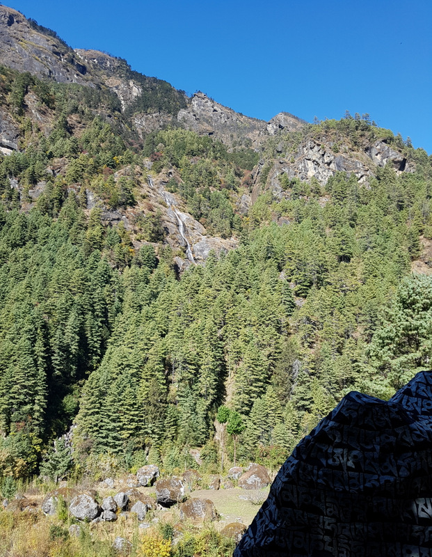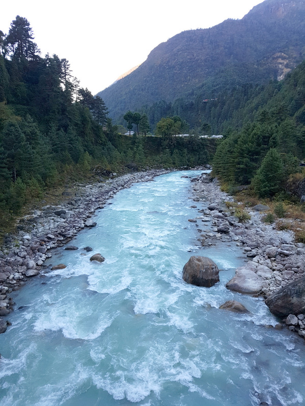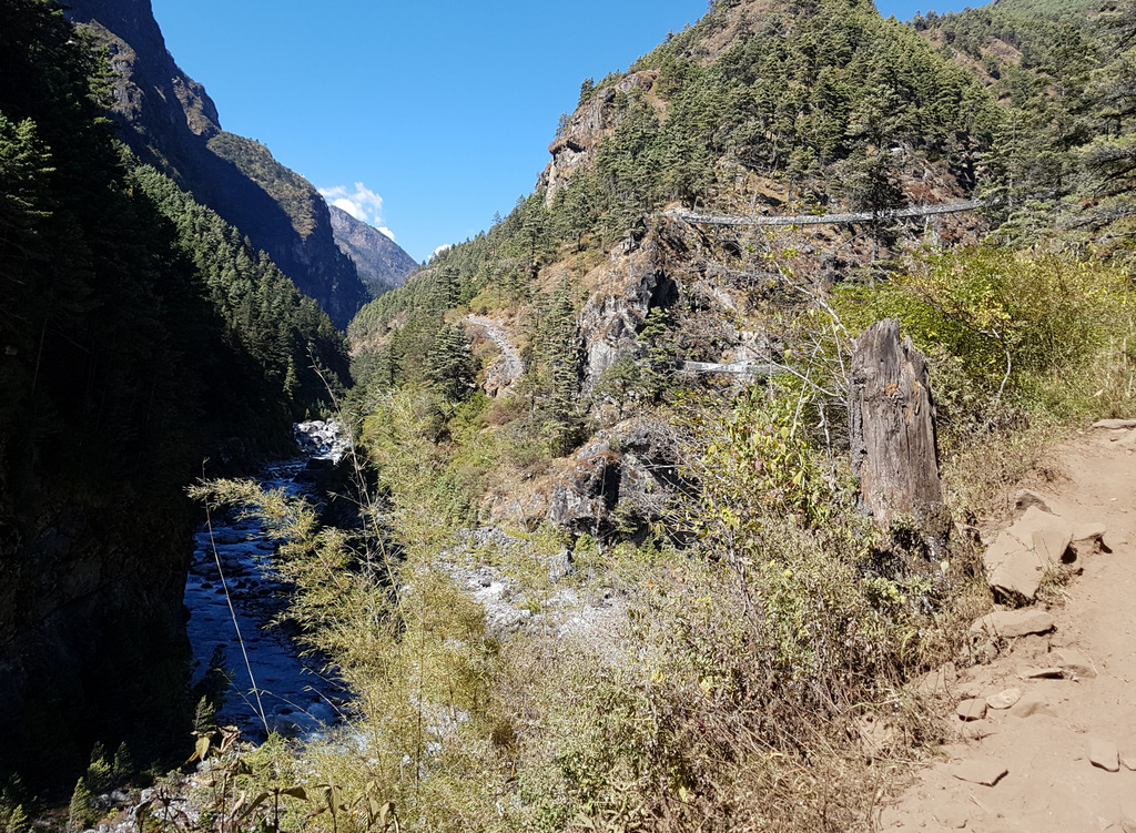 Торжественно пройдя через ворота, мы спустились по крутому склону и перешли по мостику на другой берег Дудх Коши. Прошли через Джорсале, последнюю деревню перед подъёмом в Намче, и вскоре опять перешли по мостику на берег предыдущий.