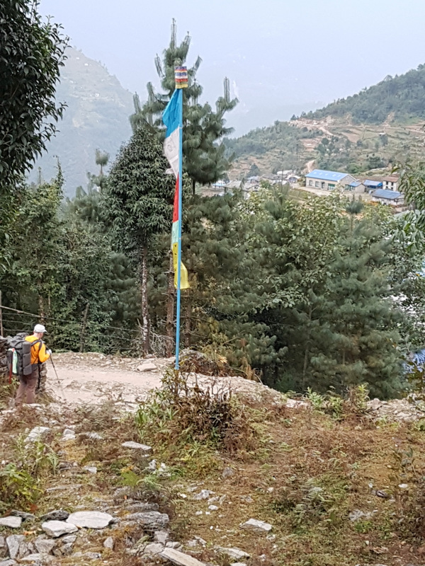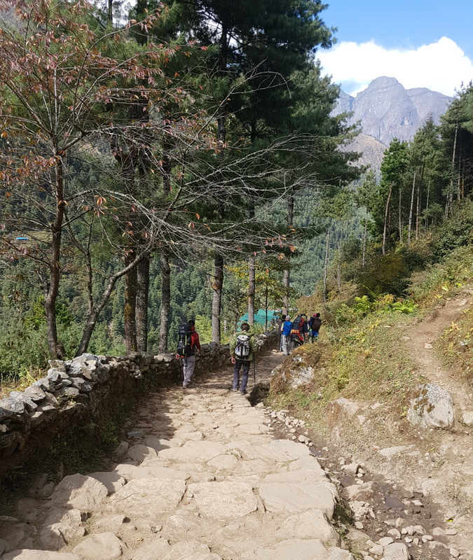 Итак, нас все обгоняли, и лишь очень пожилой англичанин в обшарпанной одежде и с видавшим виды рюкзаком шём в таком же темпе, как и мы. Он сказал, что был на этом треке много раз, но подъём в Намче не становится легче.