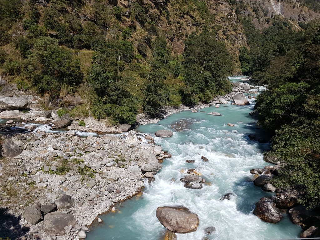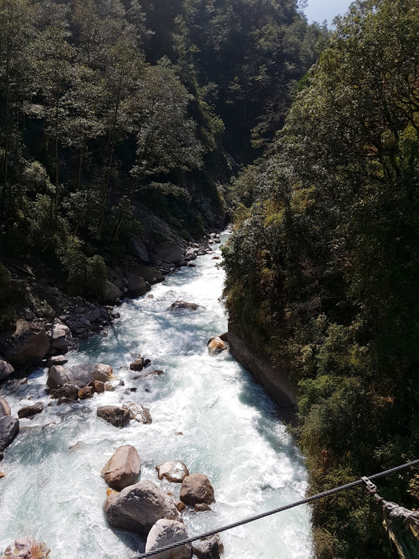 Перешли по мосту на противоположный берег — очень волнительно и даже немного страшно. Высоко. Далеко внизу шумят, сливаясь в один поток, две полноводные реки: Дудх Коши и её боковой приток Вхоте Коши. Кстати, подвесные мосты в Непале надёжные, их уже много лет проектирует и строит швейцарская фирма Helvetas.