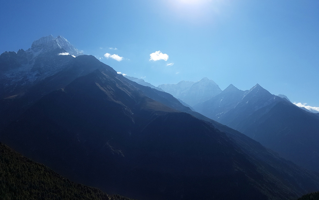 Вершина Эвереста со смотровой площадки при подъёме в Намче. Видно совсем чуть-чуть.