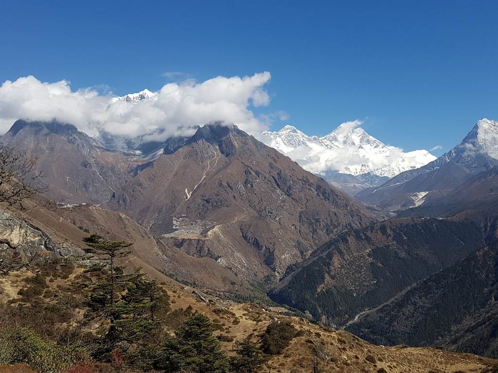 Вид на Эверест. Вдали на плато видна деревня Портце и тропа на Пангбоче.
