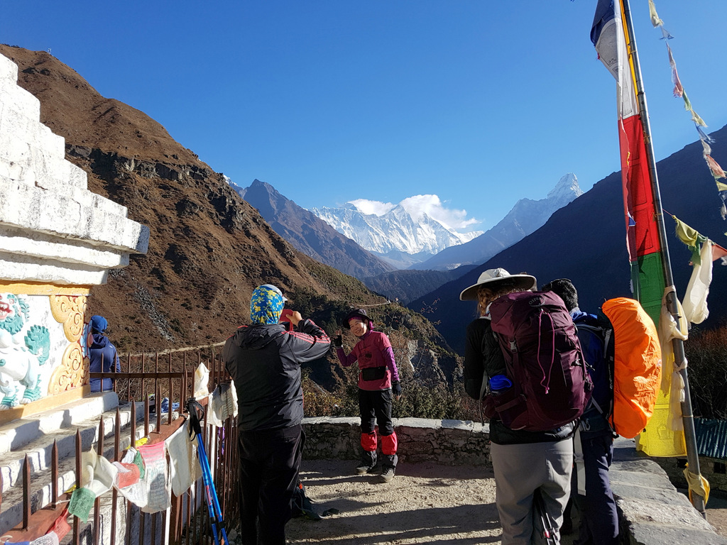 С тропы отлично видно Эверест, Лхоцзе и Ама Даблам. Небо пока чистое, и видимость хорошая. Виды, конечно, потрясающие, но толпы народа немного раздражают. Но что поделаешь, все хотят увидеть эту красоту, которой больше нет нигде в мире.