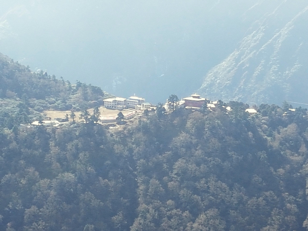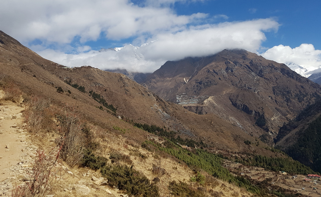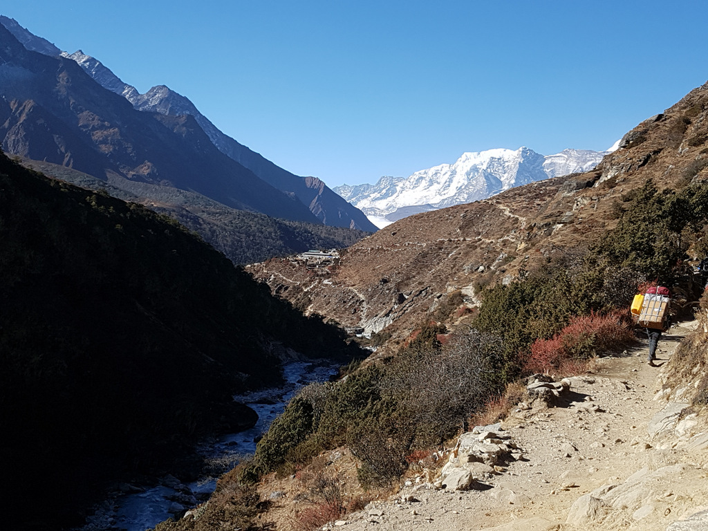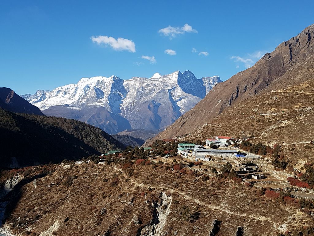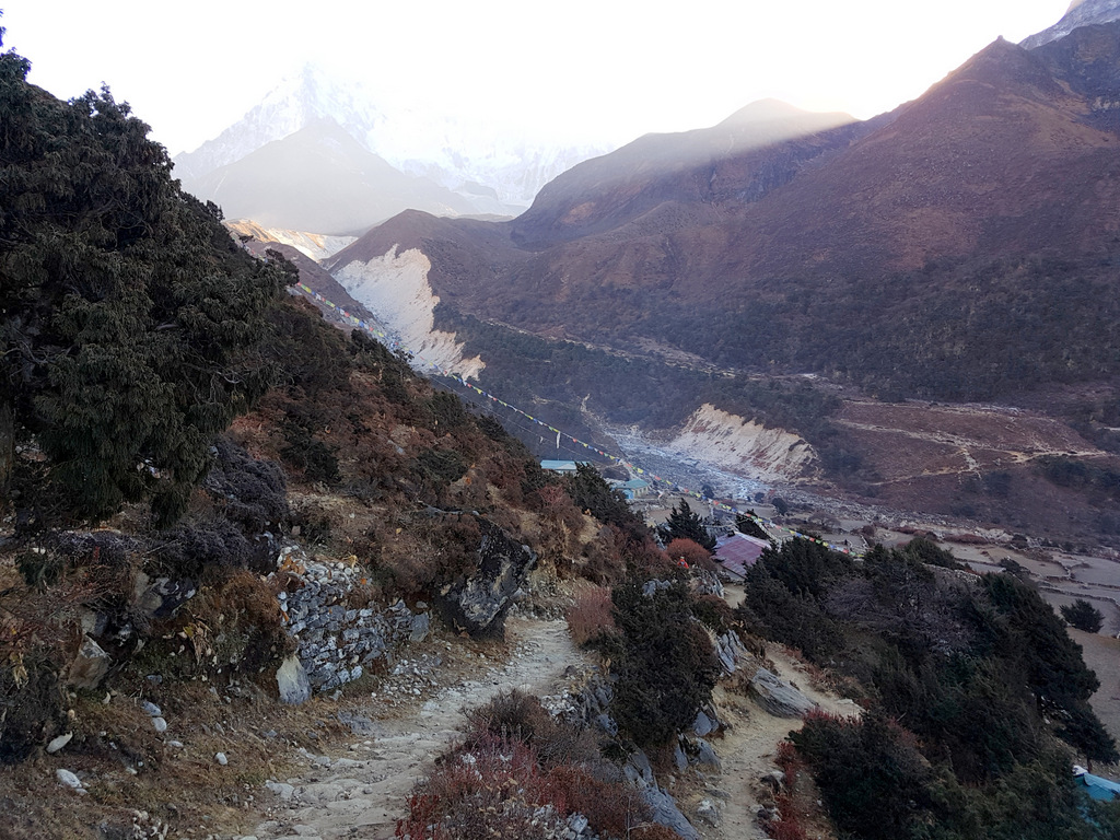 С тропы видны поселения внизу, журчащая речка Имджья Кхола и знаменитый монастырь Тенгбоче, расположенный на противоположном берегу глубокого ущелья. На всё это я смотрю с высоты.