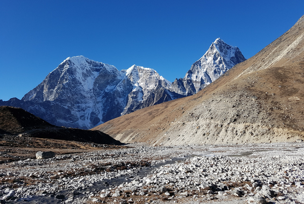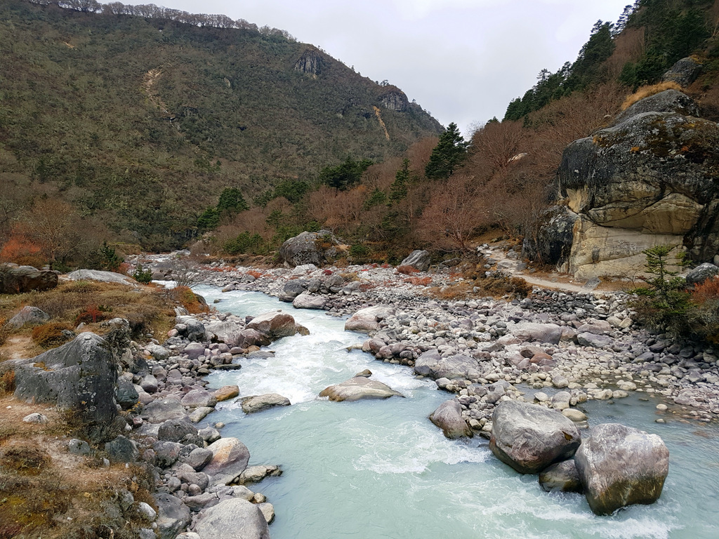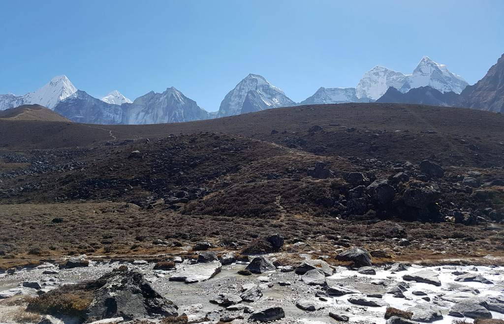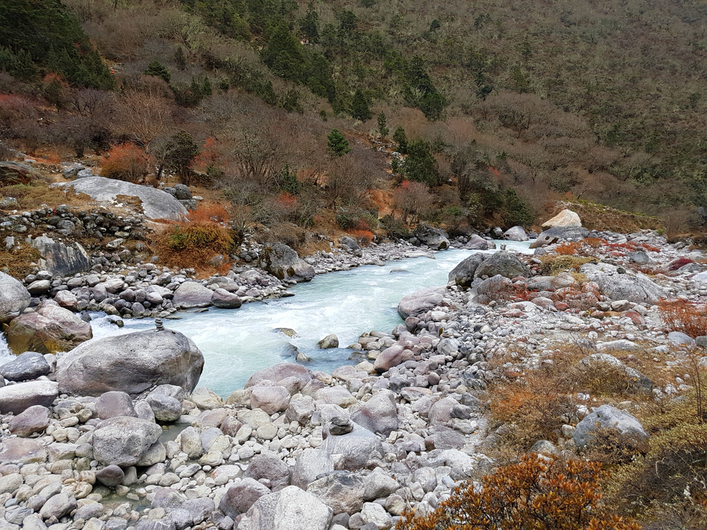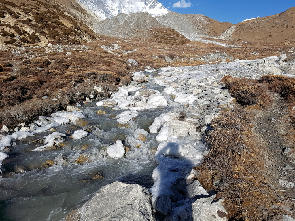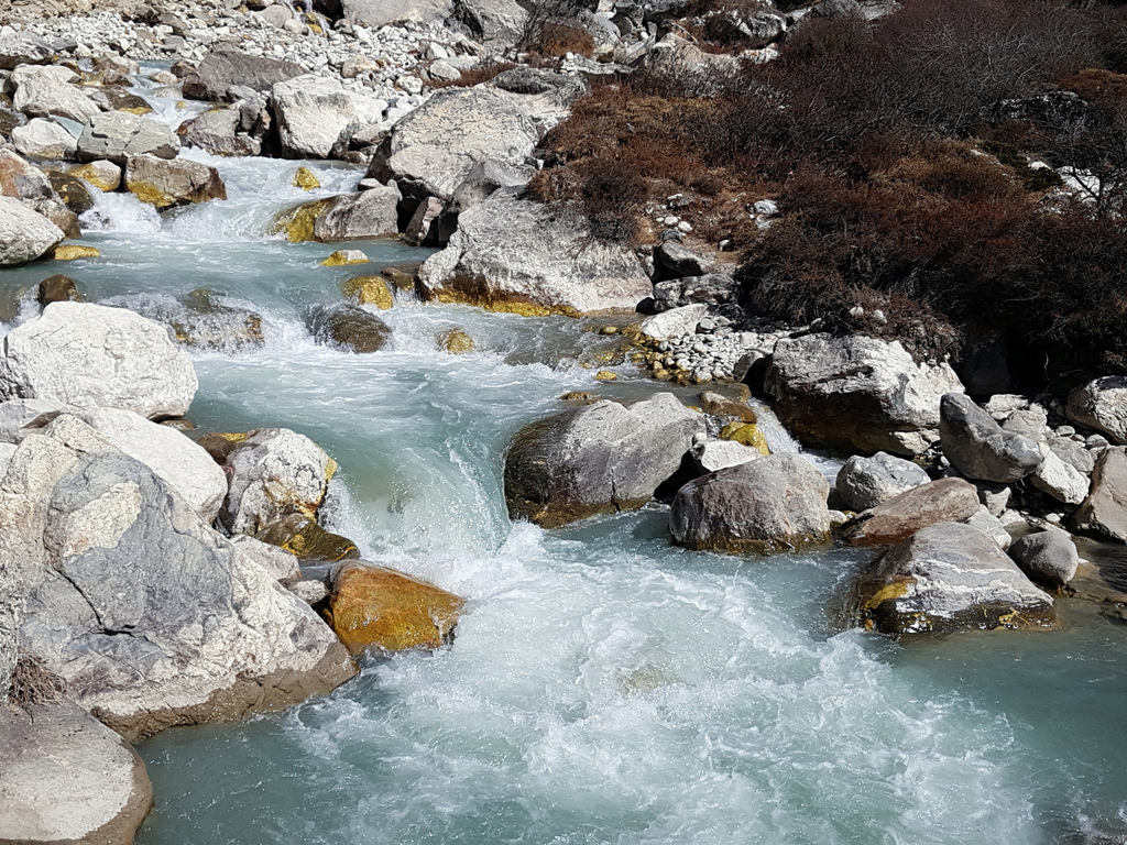 Пошли. Спустились к знакомой реке Дудх Коши. Рядом с ней мы шли пять дней, а теперь нам придётся расстаться — ущелье Дудх Коши уходит в сторону Гокио.