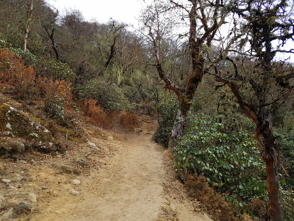 Перешли речку по мостику, и сразу начался непрерывный подъём. Подъём в Пхортце был временами крутой, временами пологий, в целом — нетрудный. Он проходил среди леса по удобной тропе без ступенек.