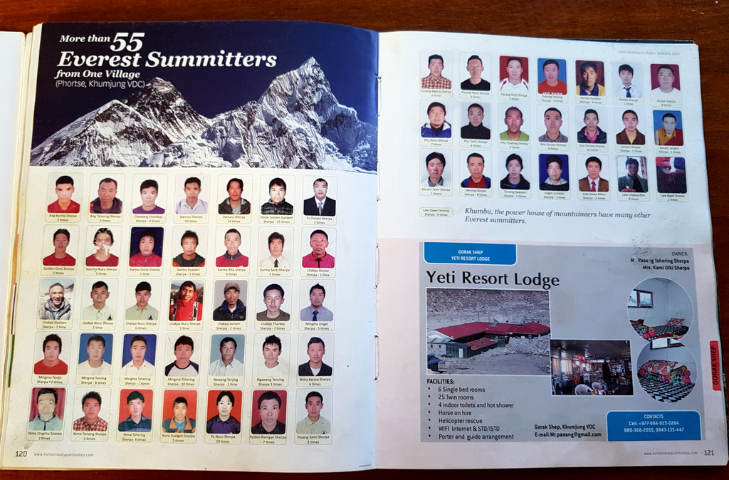 Фотографии шерпов-восходителей на Эверест из деревни Пхортце. Здесь их 50 . Но это старый журнал. Сейчас их 70, так сказала нам хозяйка лоджа.