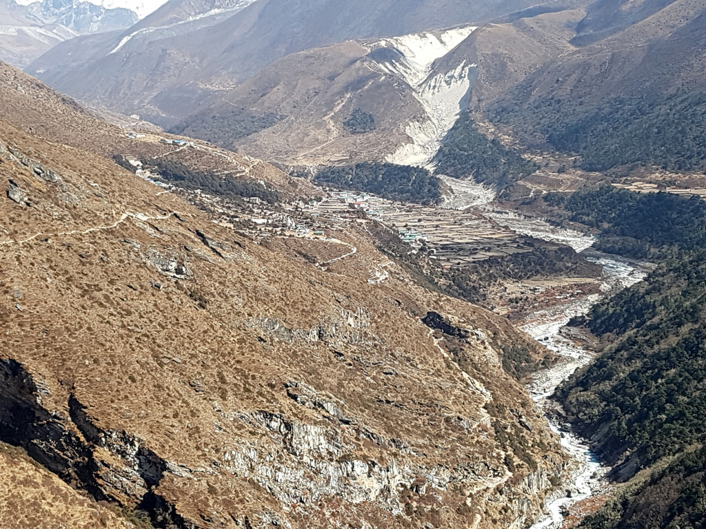 Ущелье Дудх Коши. Вид с тропы, ведущей в Пхортце. Справа видна тропа из Монга. Внизу — домики Пхортце Тенга.