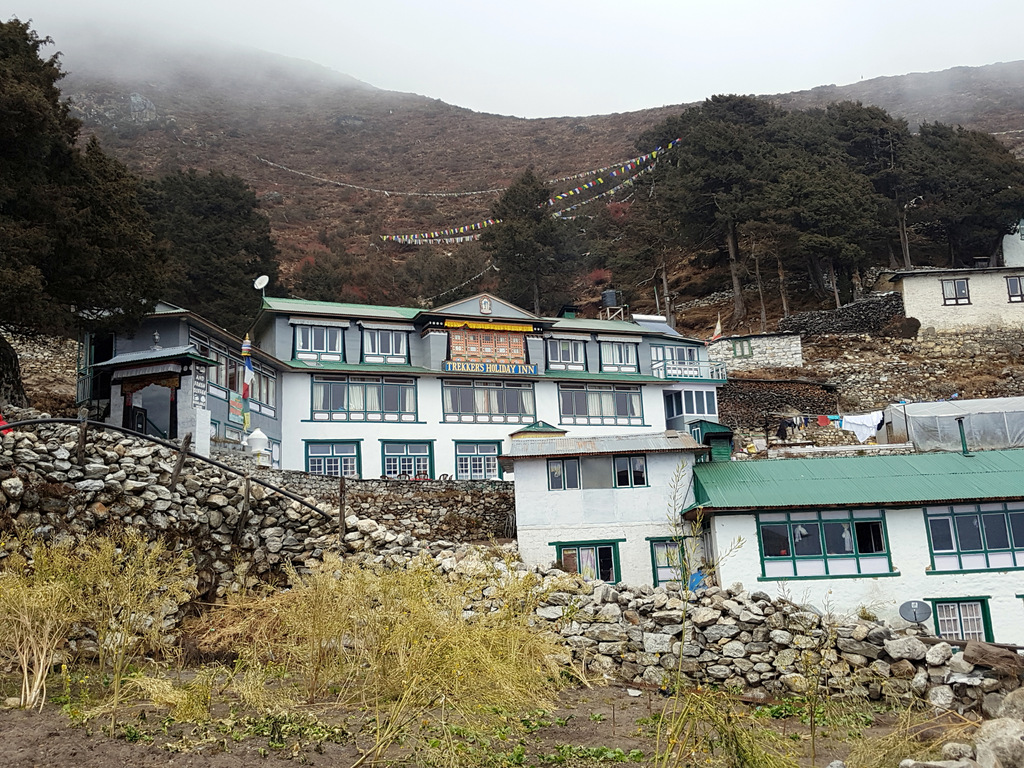 Лодж в Пангбоче. Называется Trekkers Holidey Inn. Этот лодж мы присмотрели в рекламном проспекте в Пхортце, и он первым встретился нам на пути. В него и пошли. Находится рядом с красивой Гомпой.