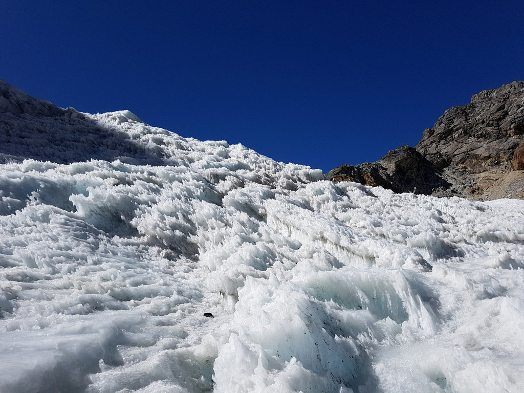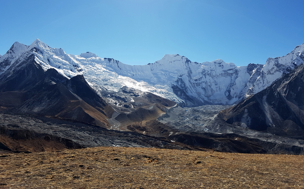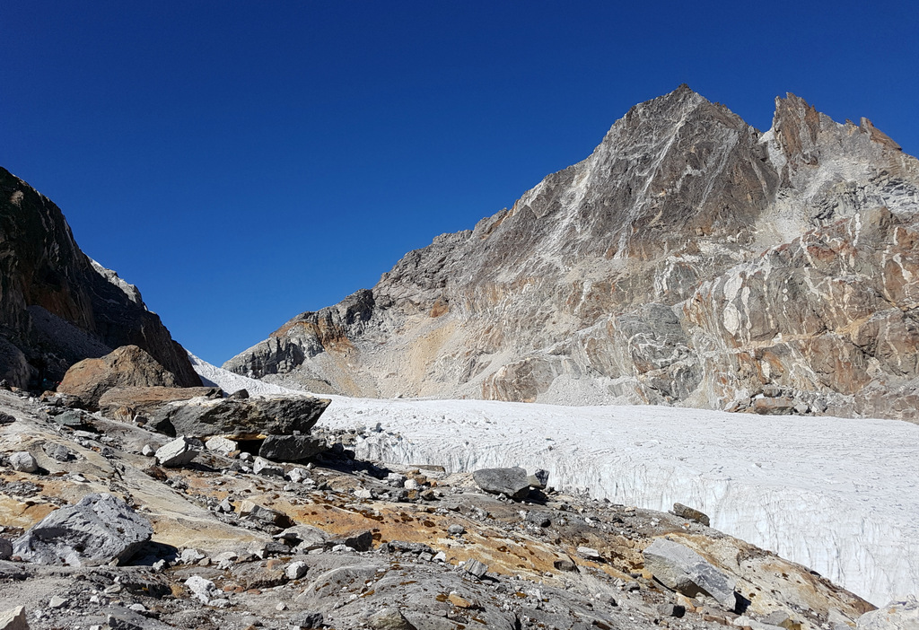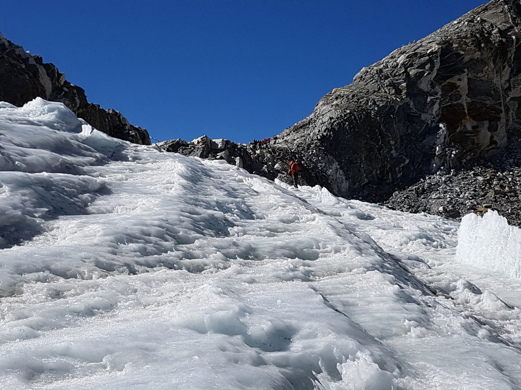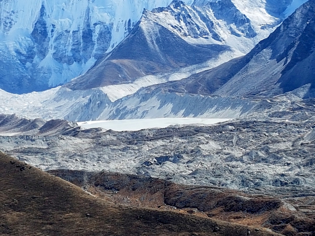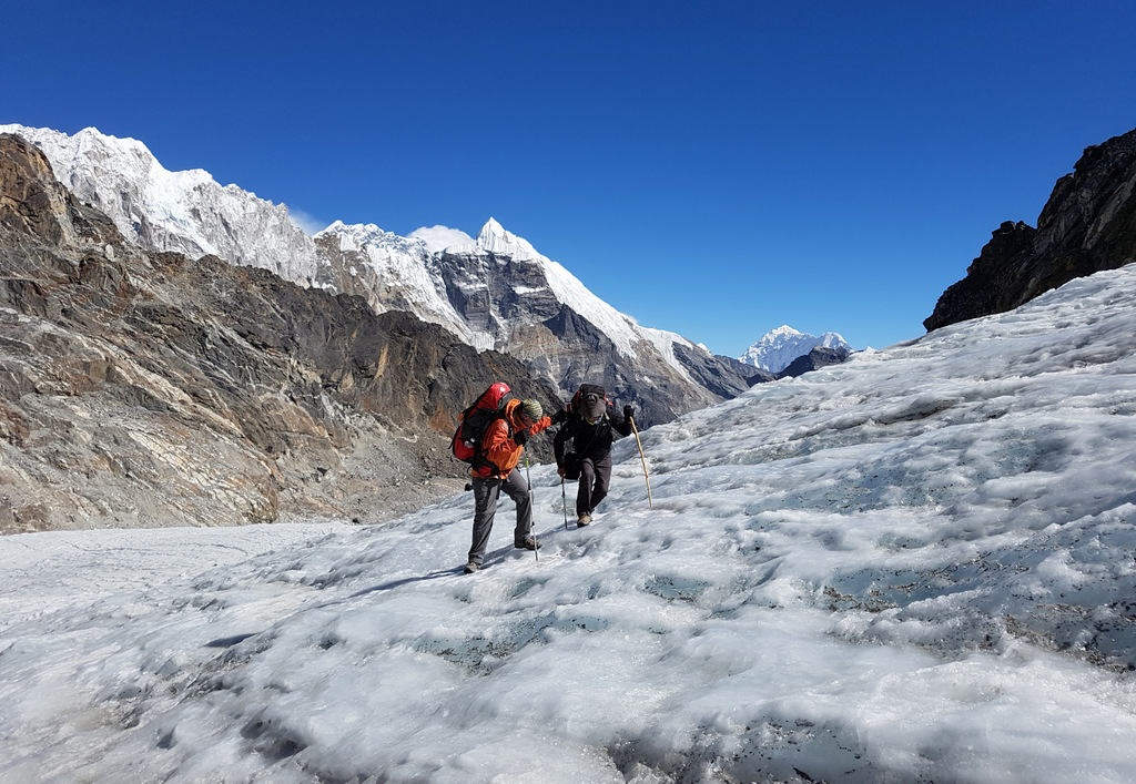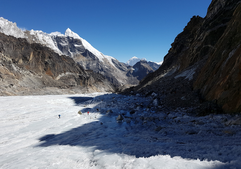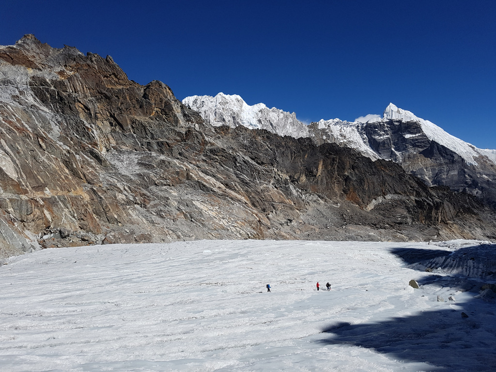После подъёма нашему взору открылся ледник, которого мы так ждали. Было видно, как его переходят треккеры, спускающиеся с перевала в Дзонглу. Им приходилось идти через ледник на спуск, и они выглядели, честно слово, как коровы на льду. Многих портеры вели за руку. В основном все шли в ботинках, лишь у некоторых на ботинки были надеты котята. А один крутой турист шёл по леднику в настоящих альпинистских кошках и шёл так уверенно, как будто идёт по тротуару в парке.