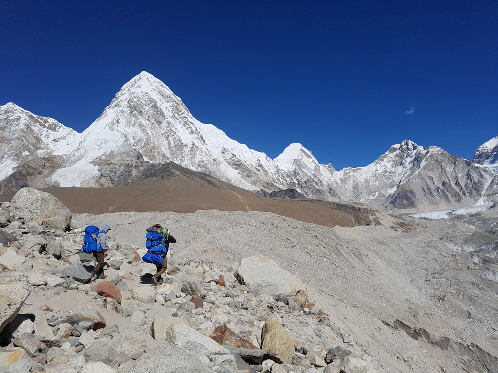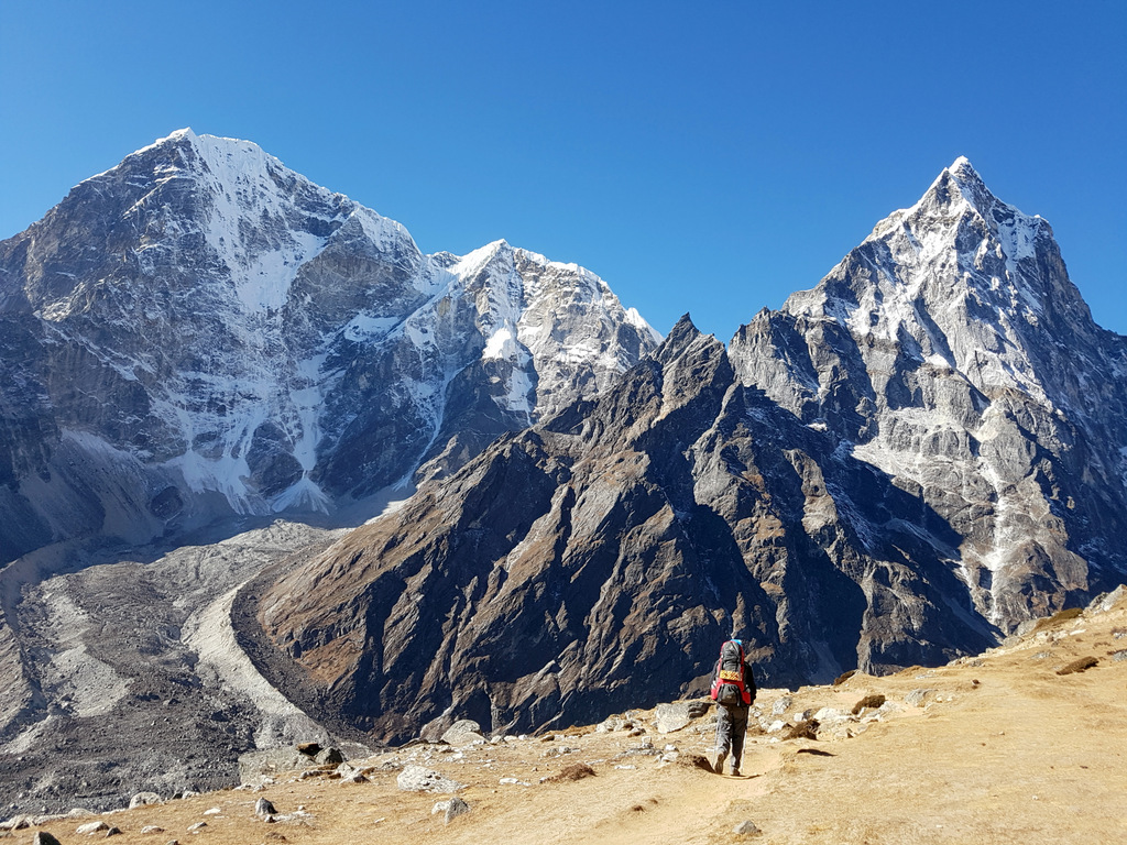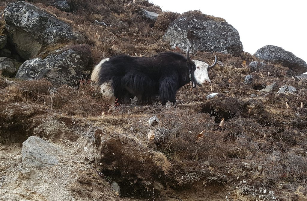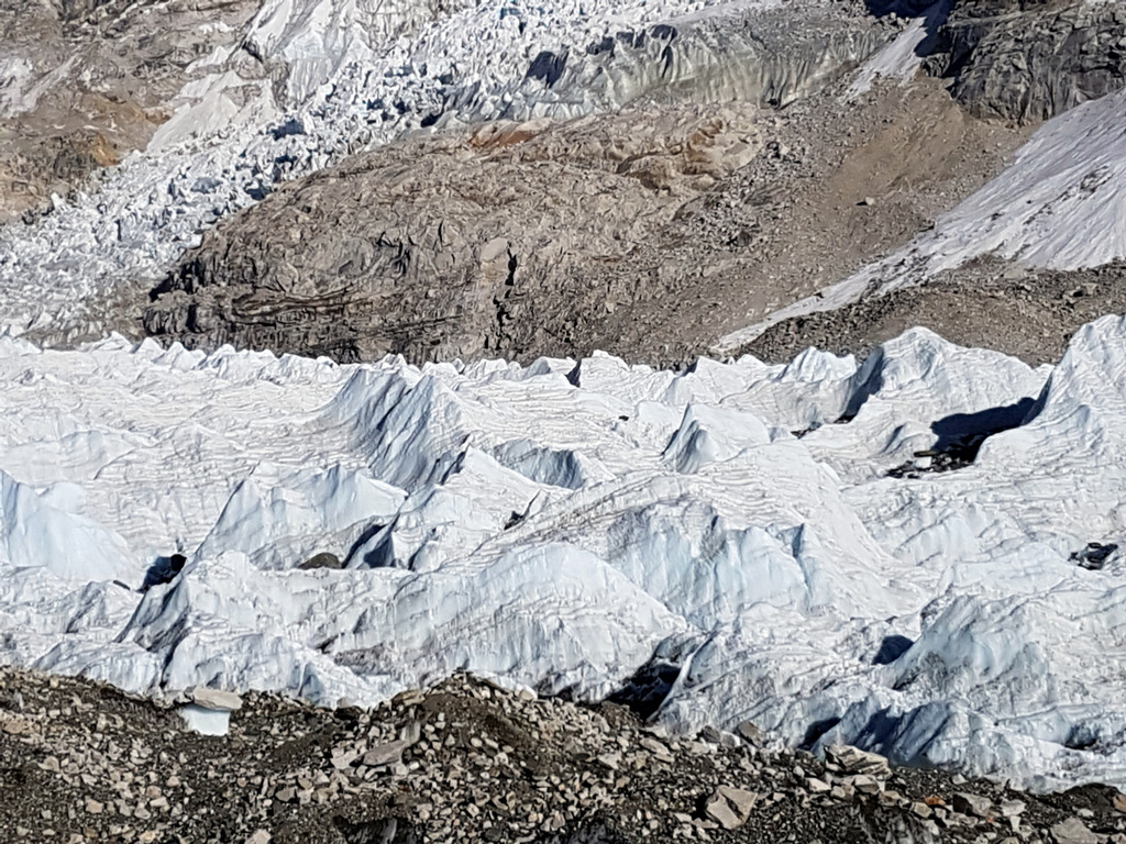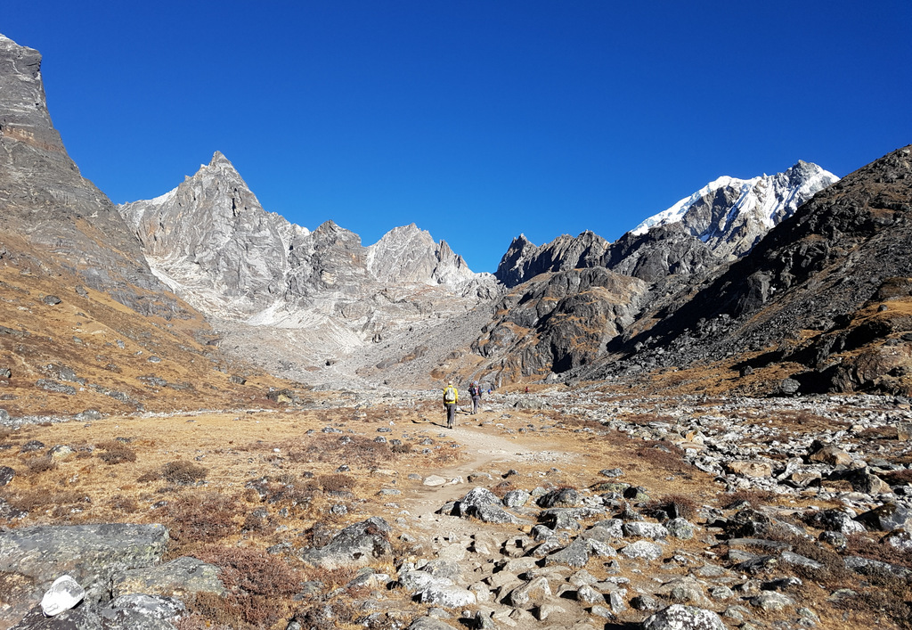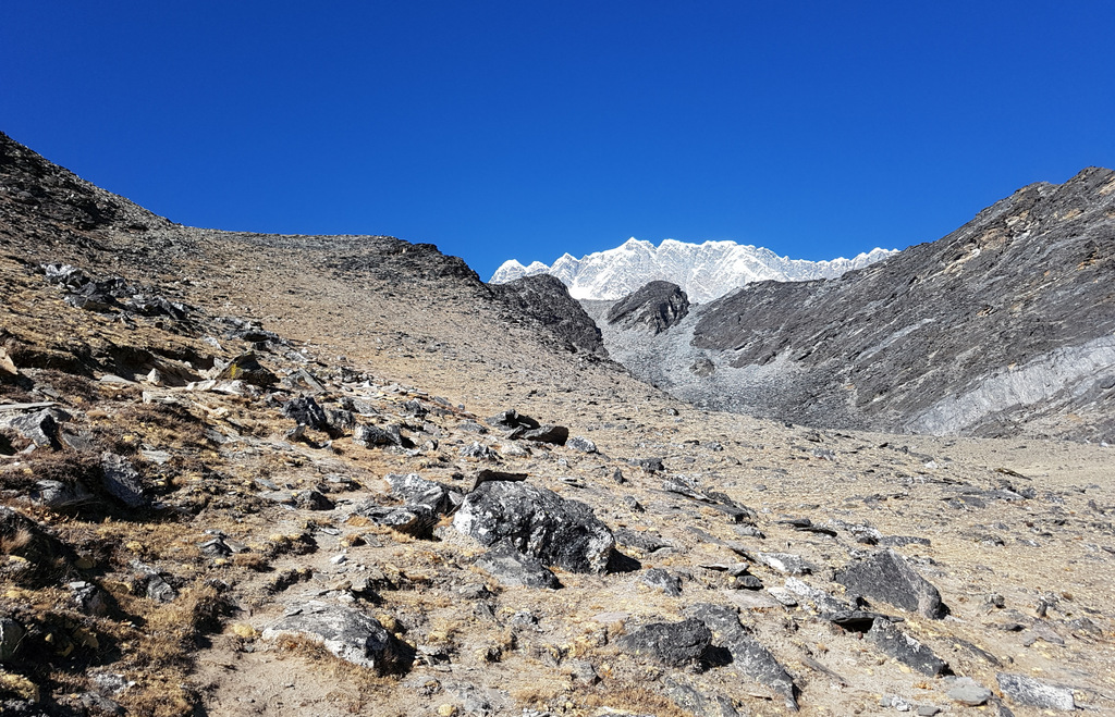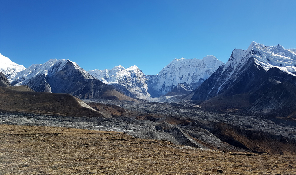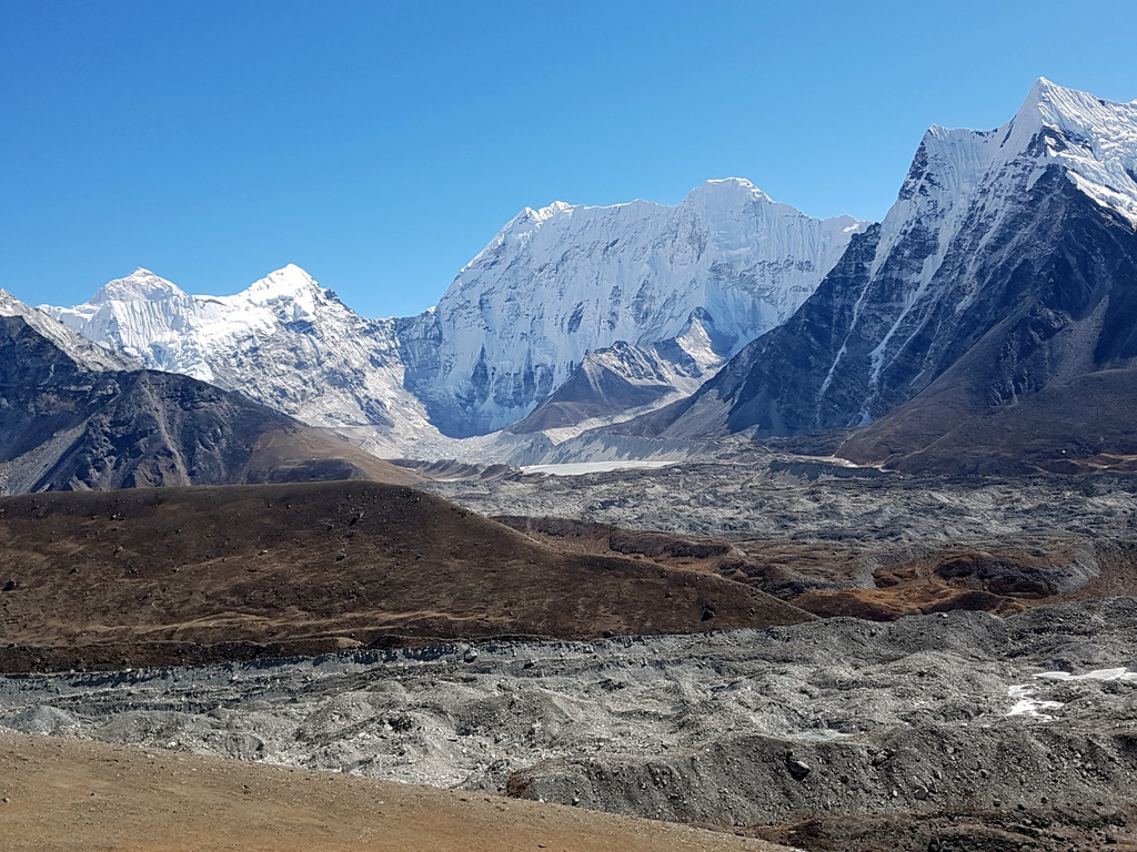 После подъёма нашему взору открылся ледник, которого мы так ждали. Было видно, как его переходят треккеры, спускающиеся с перевала в Дзонглу. Им приходилось идти через ледник на спуск, и они выглядели, честно слово, как коровы на льду. Многих портеры вели за руку. В основном все шли в ботинках, лишь у некоторых на ботинки были надеты котята. А один крутой турист шёл по леднику в настоящих альпинистских кошках и шёл так уверенно, как будто идёт по тротуару в парке.