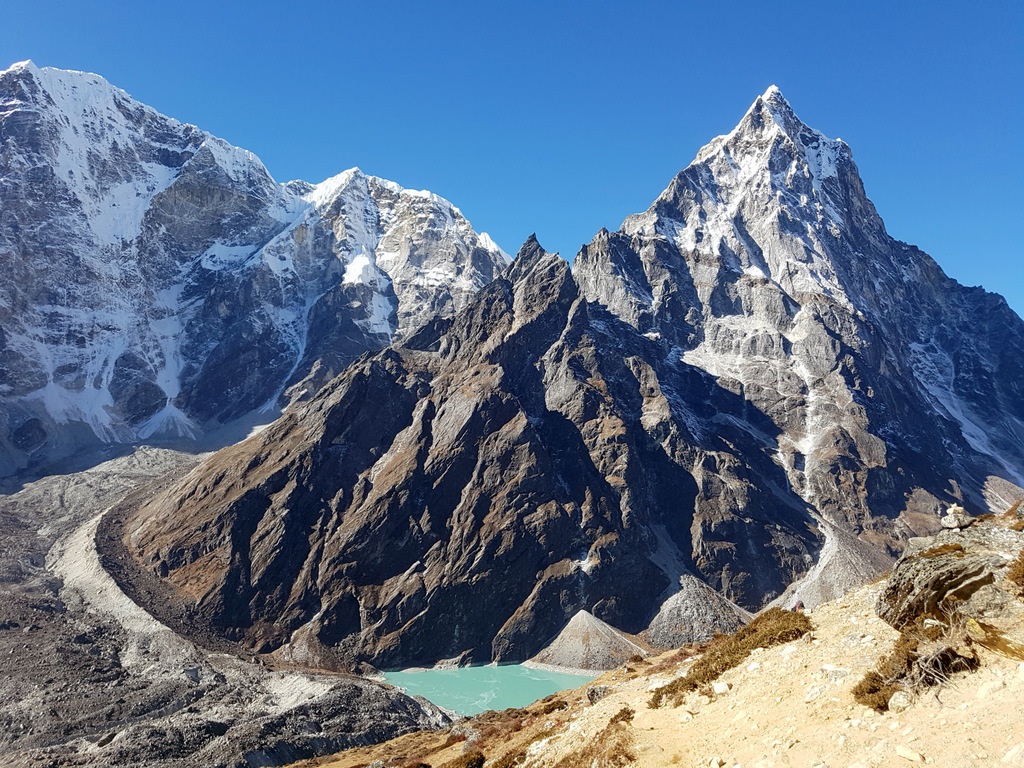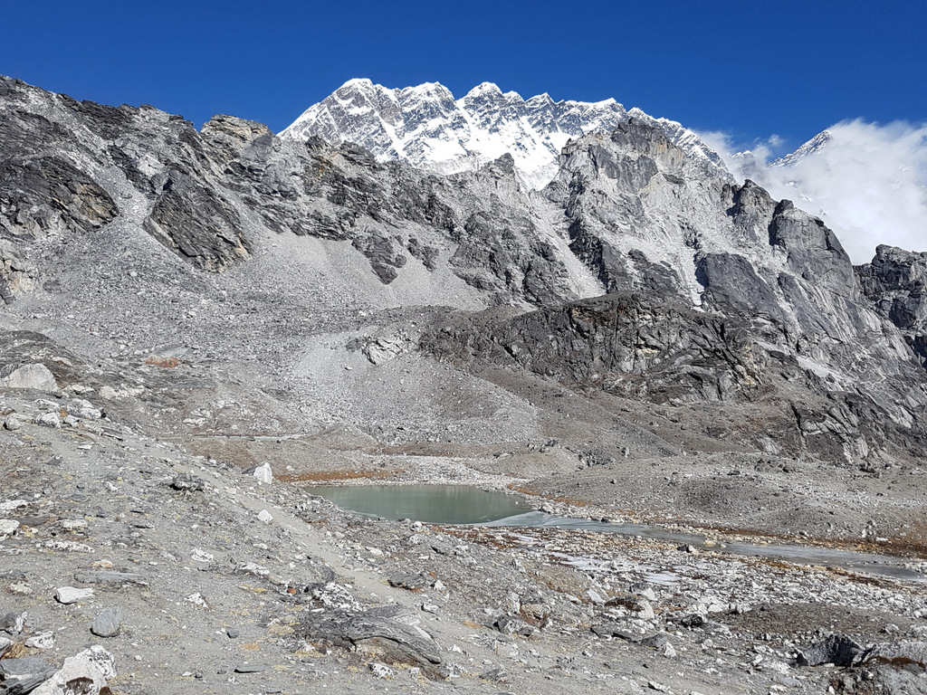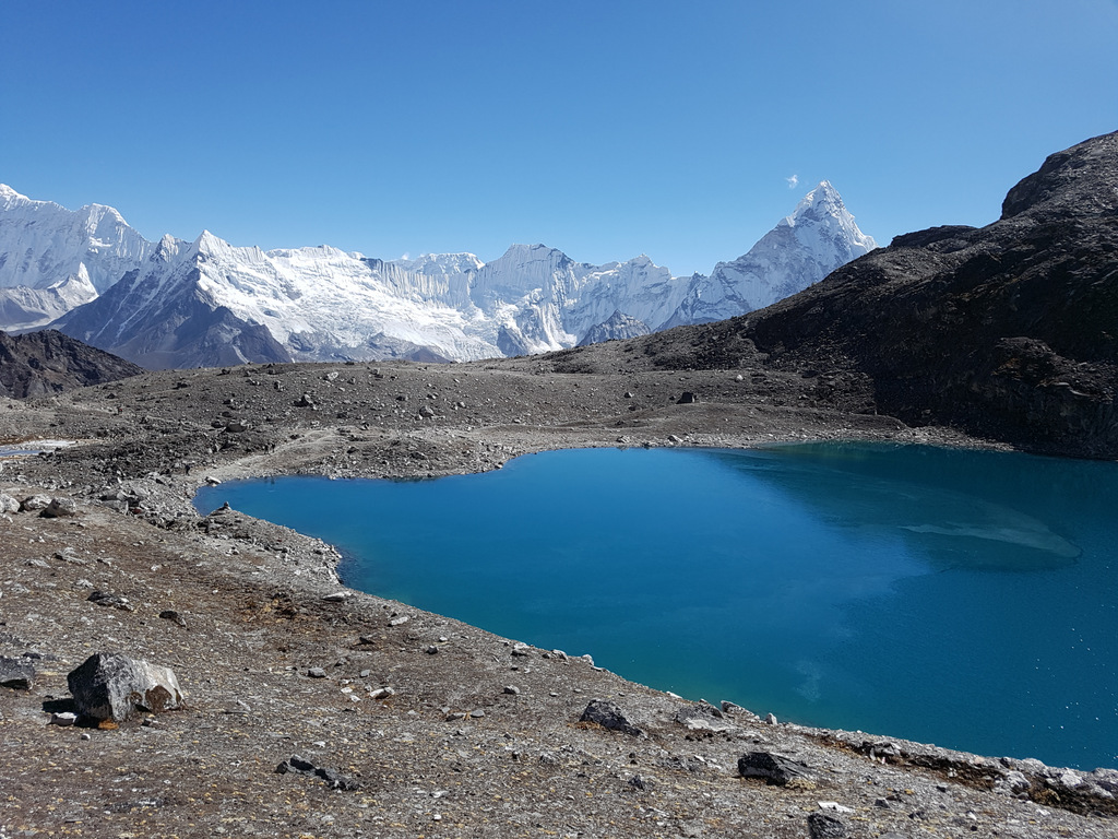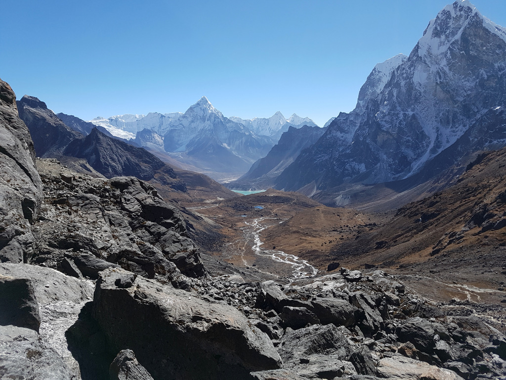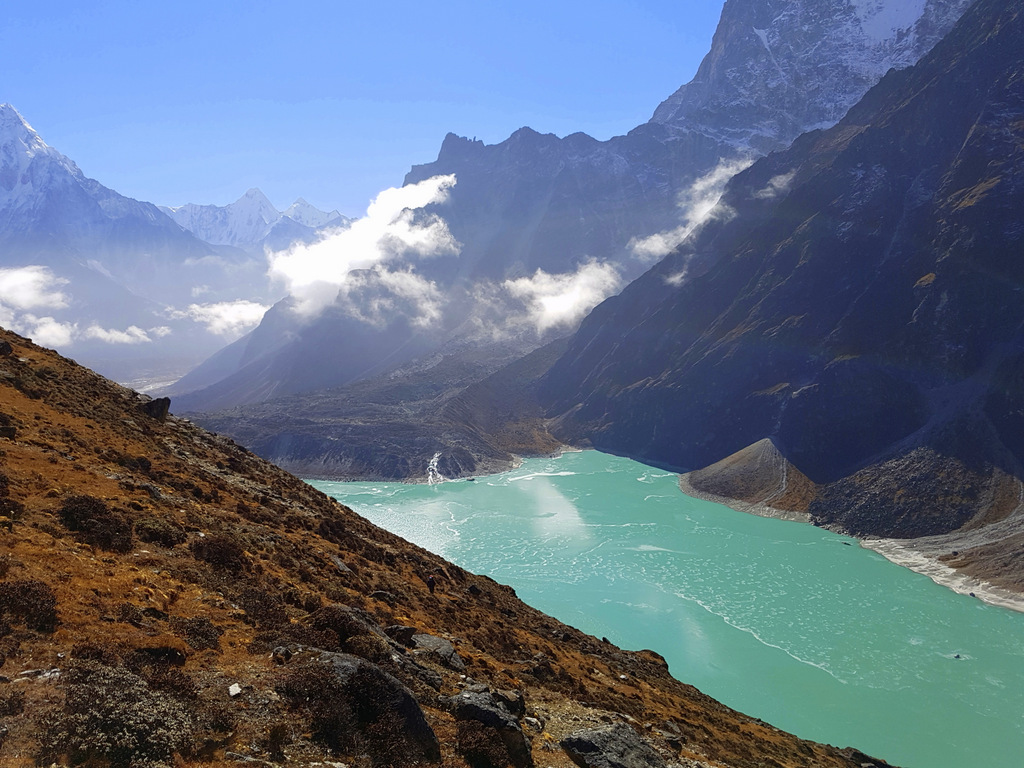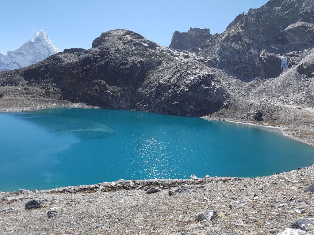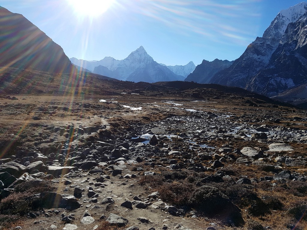 Взгляд назад. Видно вершину Ама Даблам и кусочек озера Чола Тшо.