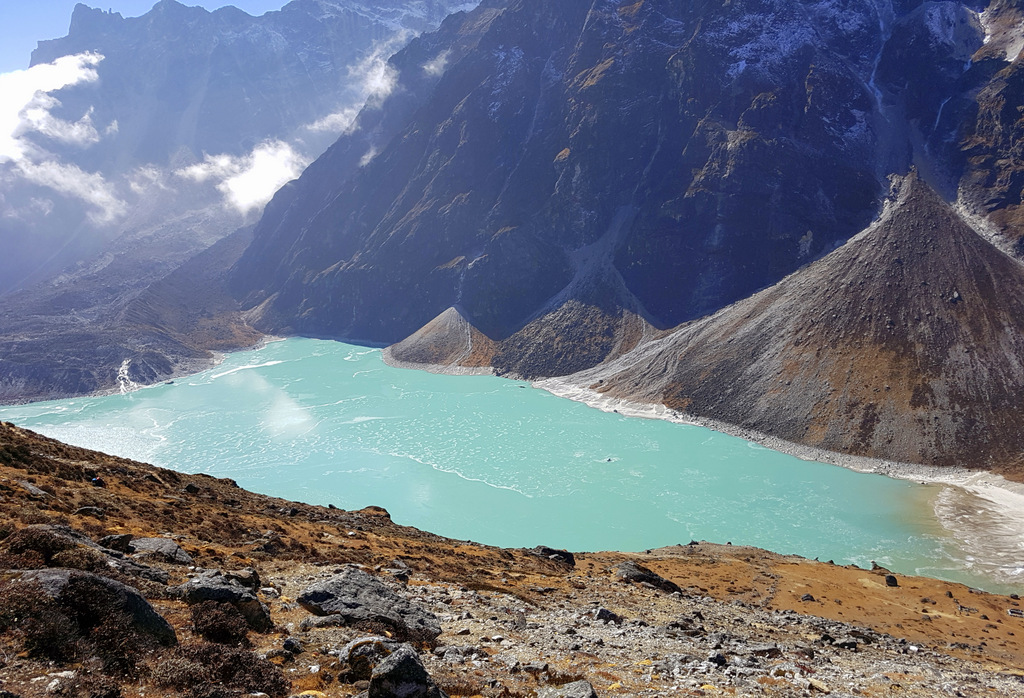 Вскоре мы вместе с тропой резко поворачиваем вправо и заходим в узкое ущелье. С левой стороны возвышается гора Чоладзе с её впечатляющей отвесной северной стеной, справа наша тропа. Внизу фантастической красоты озеро Чола Тшо. Оглушительно бирюзовое. Немного замёрзшее, но есть и живая вода, переливающаяся на солнце.