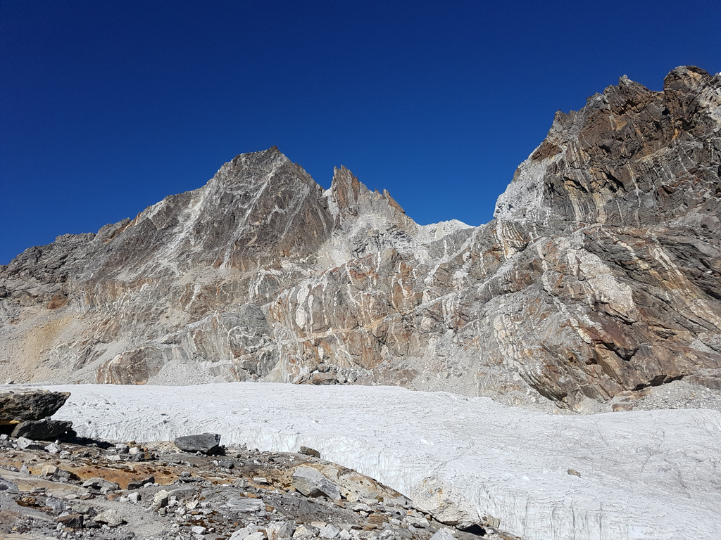 Сразу за ледником — перевал. Чтобы на него попасть, нужно залезть по очень крутой скале. Подъём невысок, метров 20, наверное.