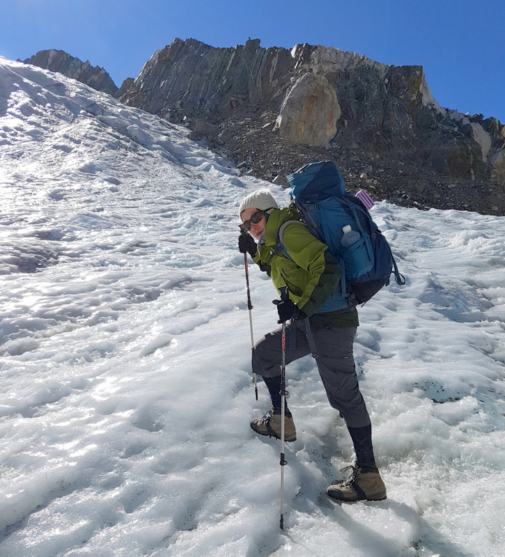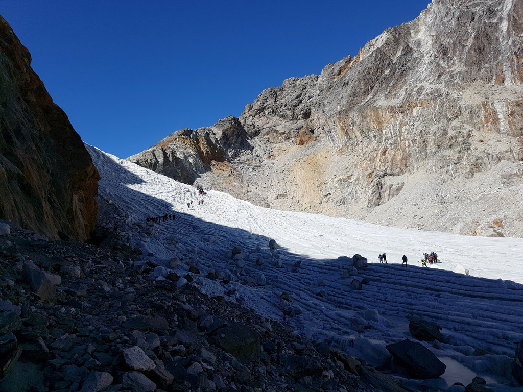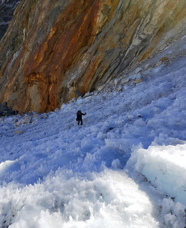 Мы смотрели на этих людей и думали, что находимся в чуть лучшем положении, чем они, ведь мы будем по леднику подниматься, а это безопаснее. А вообще, ледник хоть и пологий, но он совсем не безобидный. Не дай бог там упасть, понесёт вниз по скользкому льду — без ледоруба не остановишься. А в конце ледника — высокий обрыв, это мы видели. Решили, что будем идти по леднику на пределе осторожности и взвешивать каждый шаг.