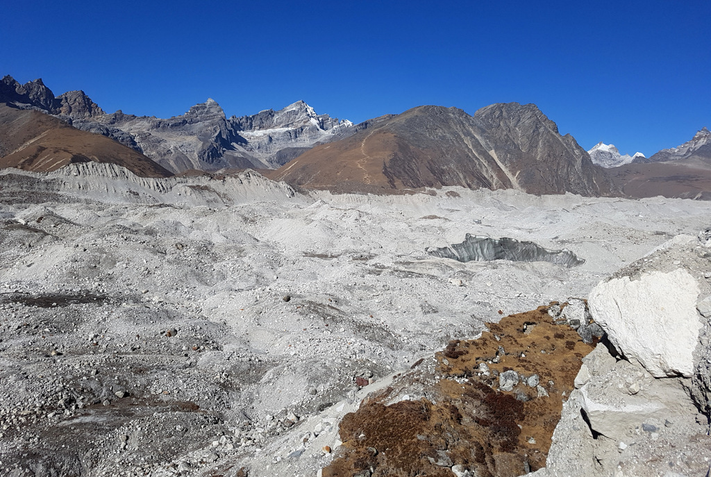 Ледник Нгозумба. Время 9:20. Небо голубое, ни облачка. Кстати, я увидела тропу на горку (в центре кадра) и подумала, что нам придётся туда подниматься. Но оказалось, что — нет.