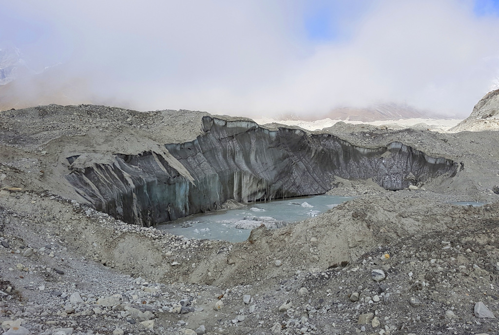 Ледник имеет примерно тот же вид, что и ледник Кхумба, который мы пересекали после перевала Конгма Ла. Те же завалы щебёнки, вздыбленные каменистые холмы, большие озёра, увенчанные гигантскими глыбами льда. Зрелище реально нереальное.