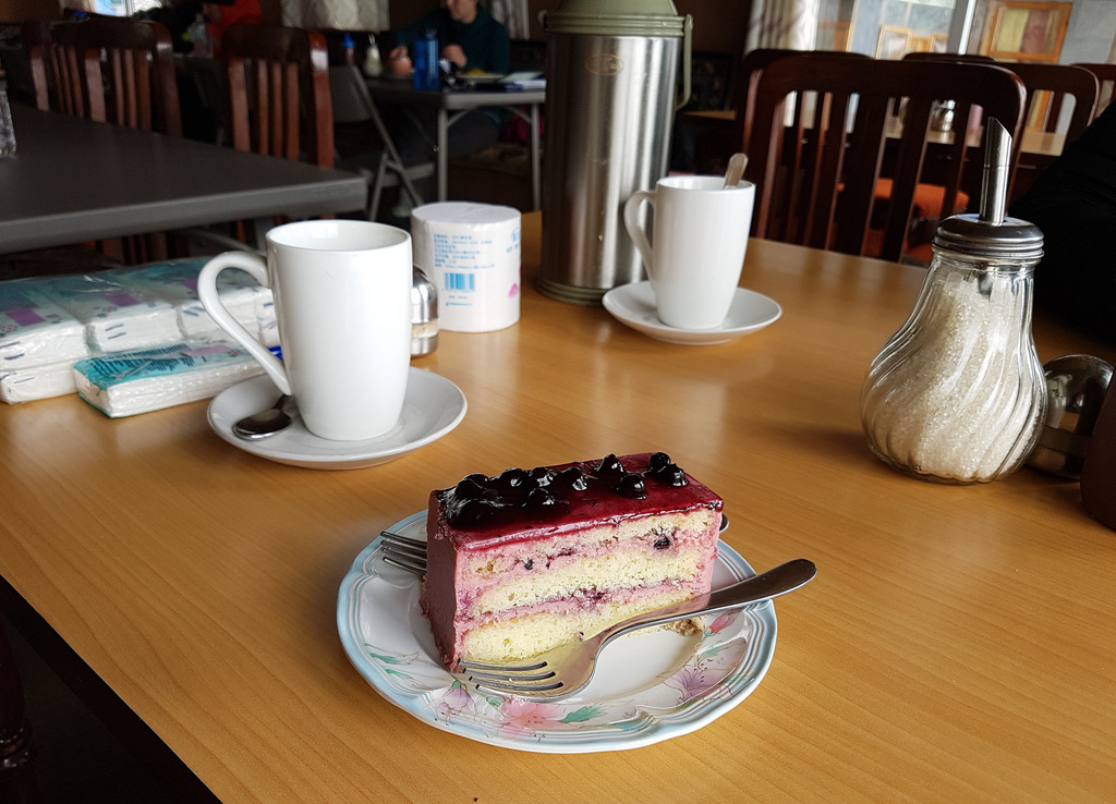 Столовая тёплая, и даже днём там топятся две большие печи. Из столовой замечательный вид на озеро. Есть своя кондитерская с выпечкой. Пирожные выглядят соблазнительно, завтра попробую.