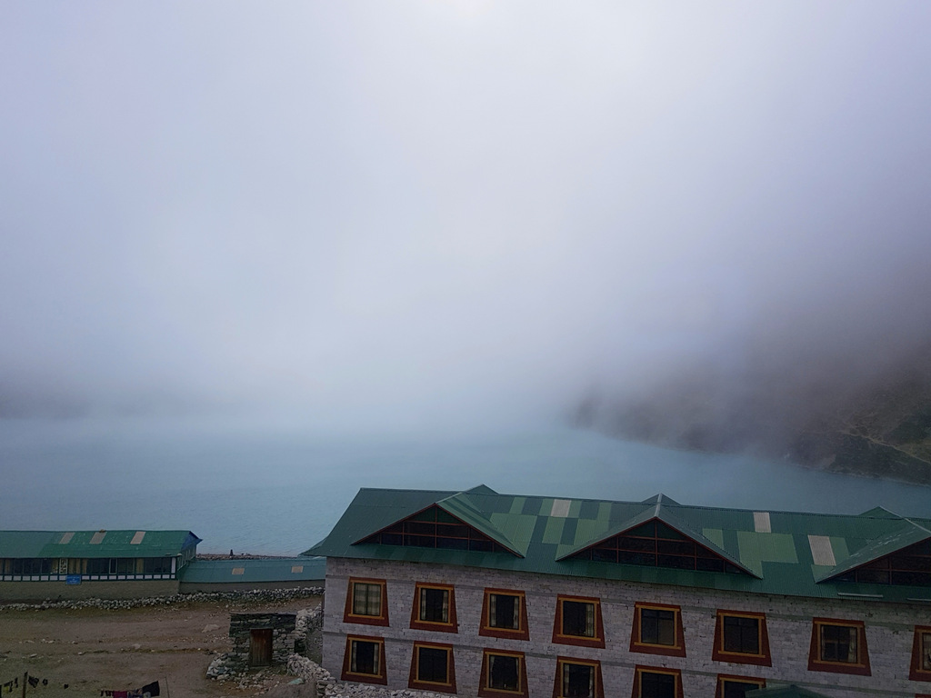 Ледник Нгозумба. Время 9:46. Всё затянуто облаками. Видимости никакой.