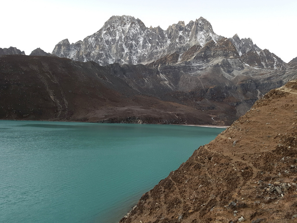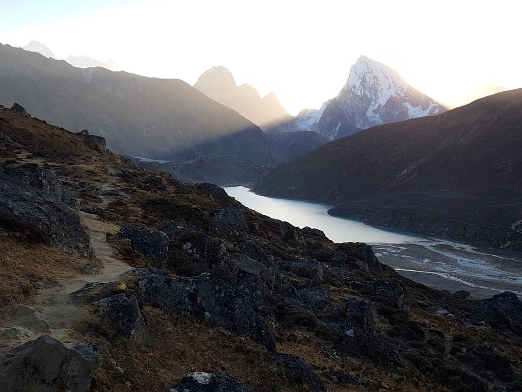 По моему, из Гокио мы вышли самыми первыми. Прошли по пологой тропе вдоль озера. Только-только рассвело. Виды красивые.