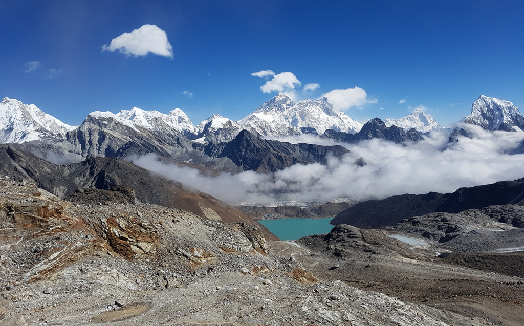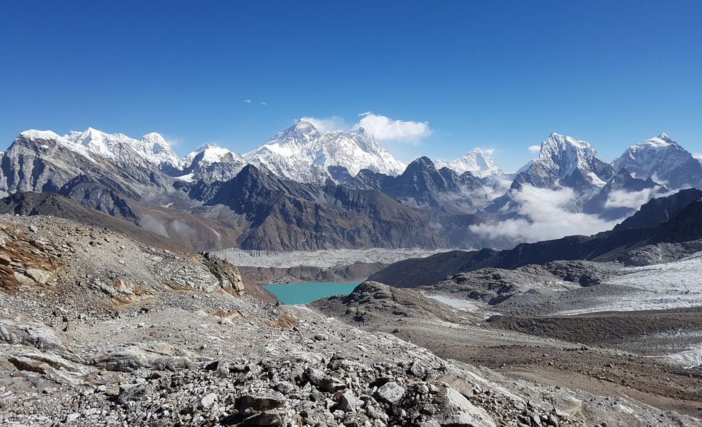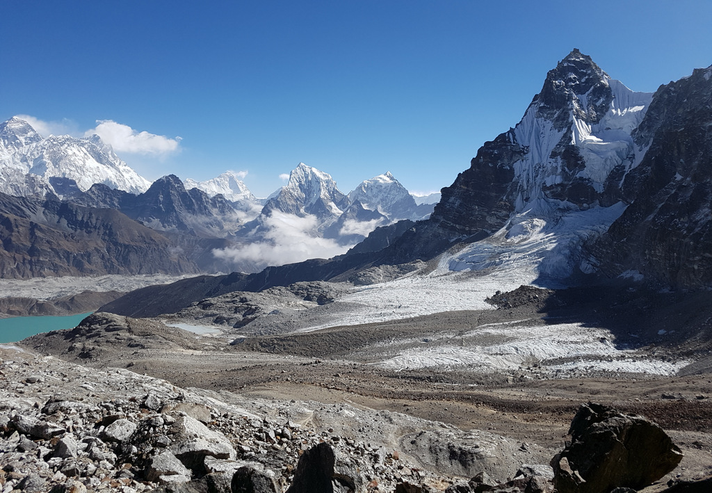Вид с перевала Ренджо Ла, один из самых красивых на этом треке. Эверест гордо возвышается в центре.