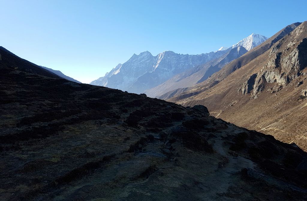 Тропа на верхние озёра. Немного видно восьмитысячник Чо-Ойю.