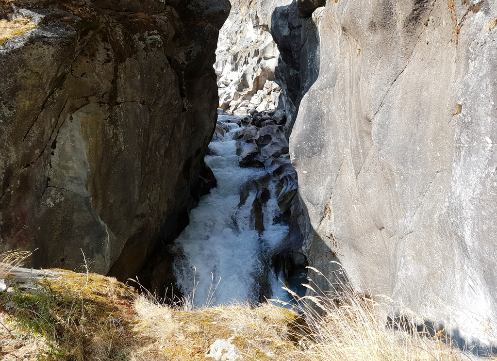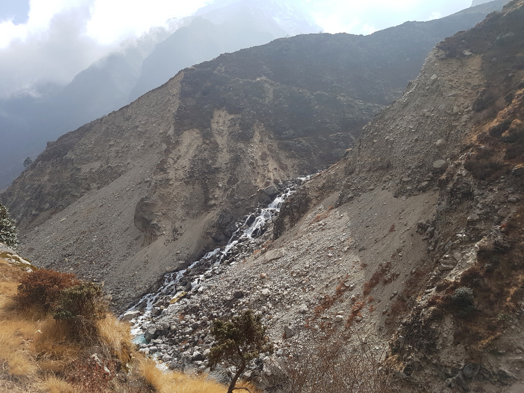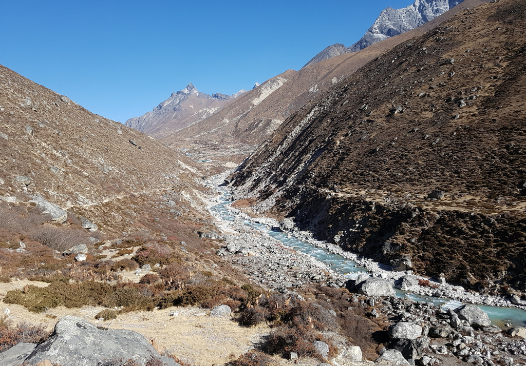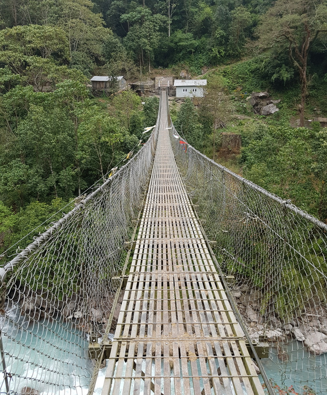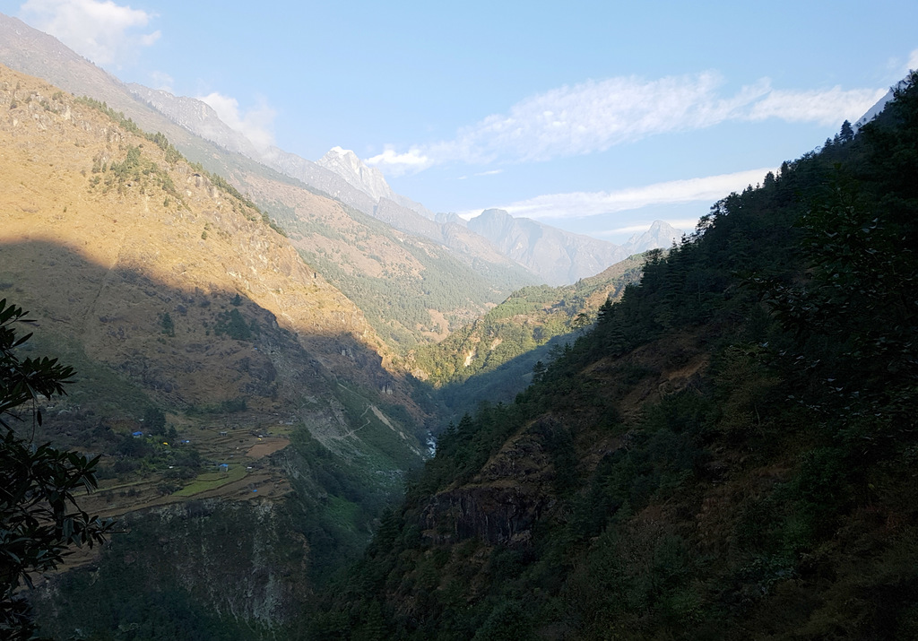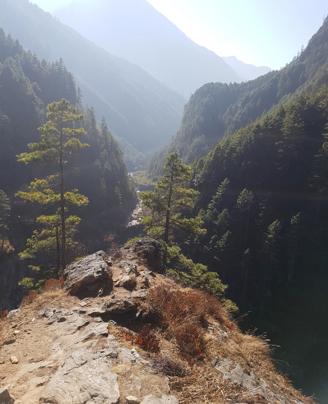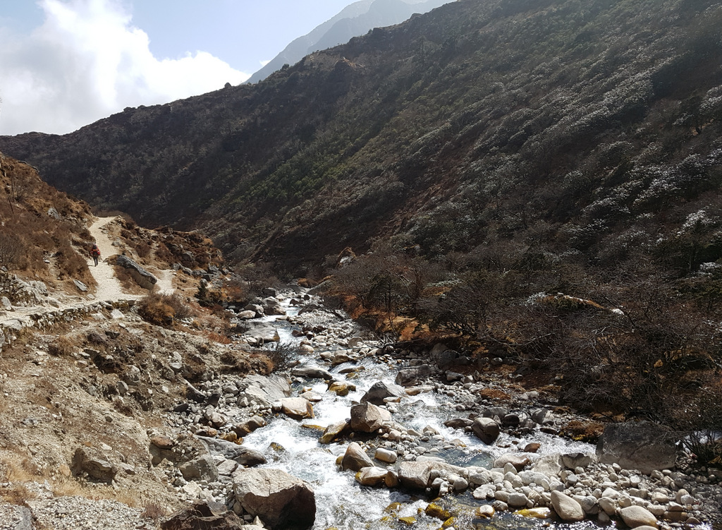 Довольно пологая тропа на каком-то этапе сменилась очень крутым спуском по неглубокому ущелью. Я просто шла за Сашей и не следила за тропой, и продолжая идти по ущелью прямо, мы вышли вниз в широкую долину, где глубоко внизу шумит горная река. Впереди видны какие-то домики, но это — не Лунгдхен.