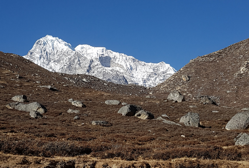 Слева — гора Gyachung Kang (7952), самый высокий семитысячник (гора с «ушками»).