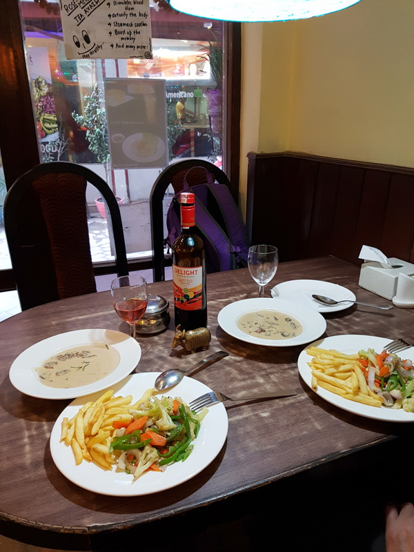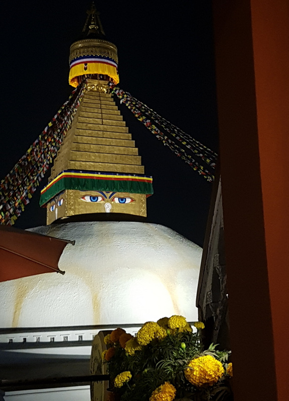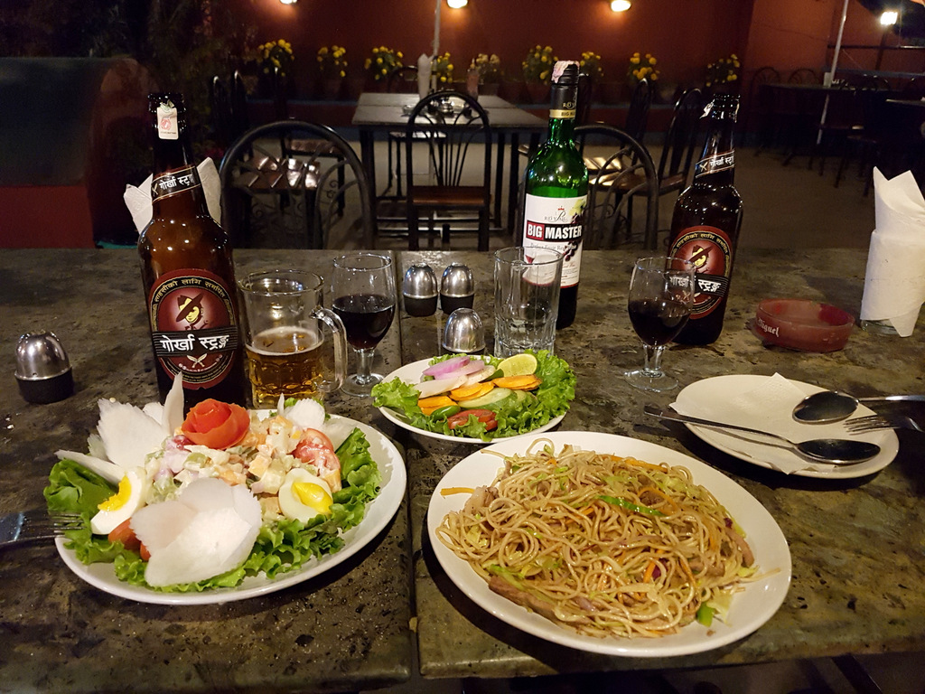 Вечером пошли в уже знакомый ресторан над гостиницей. Отметили окончание трека. Отошли от адской поездки и приятно провели время. Вкусная еда и вид на Ступу.