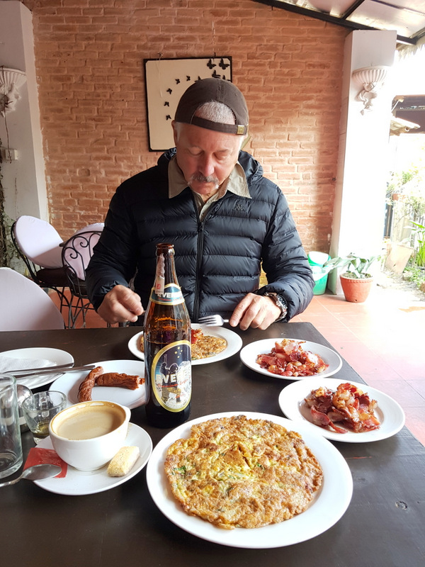 Завтрак туриста. Бекон, колбаски, омлет, кофе. И пиво Эверест.