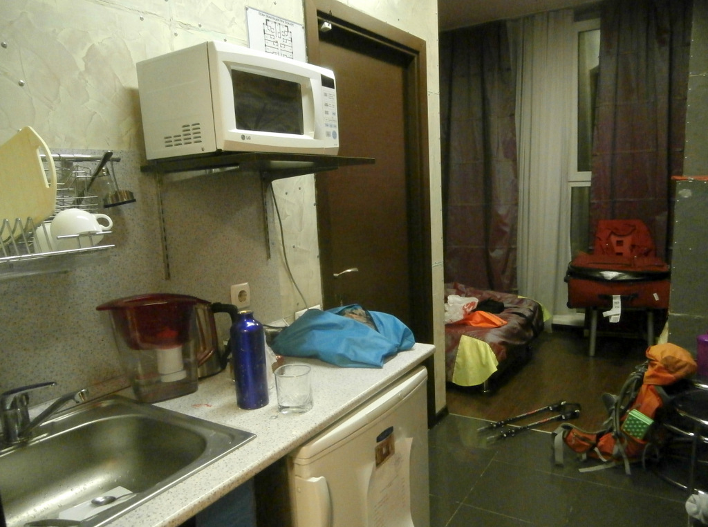 Заселилась в гостиницу «Турист», заказанную заранее через букинг. Комната нормальная. Есть даже мини кухня. Намерения хорошие, но до конца их не довели — электрический чайник поставили, а вот немного заварки и сахара положить не додумались.