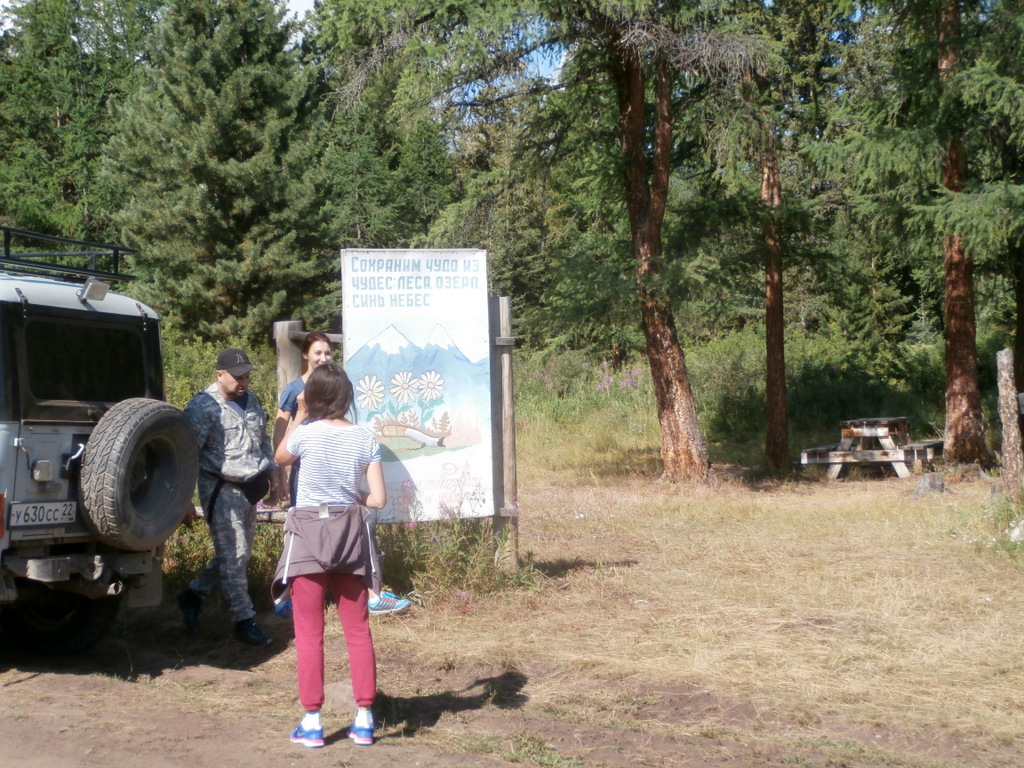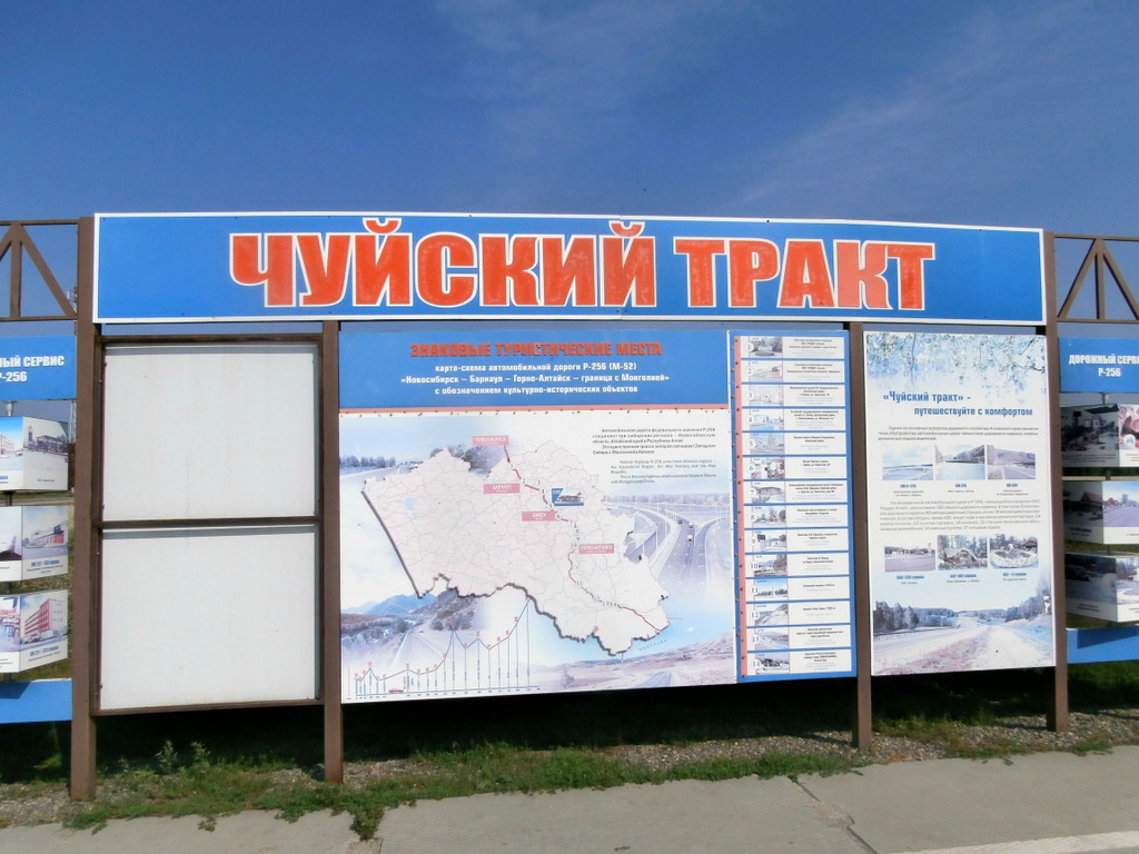 Остановка в пути. Рассматриваю информационный стенд о Чуйском тракте, по которому мы в данный момент едем.