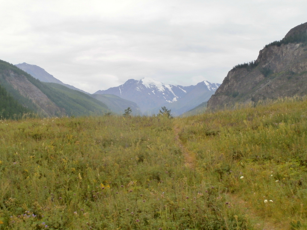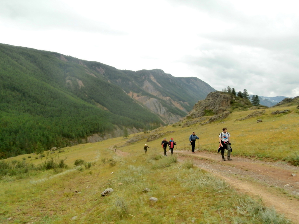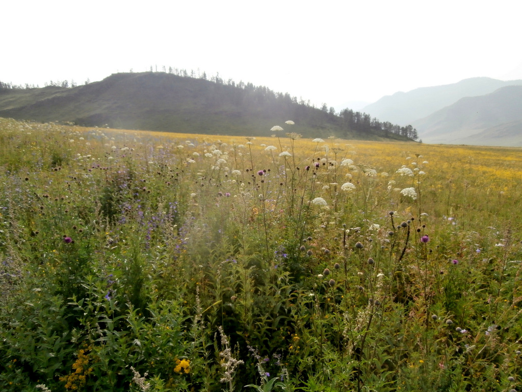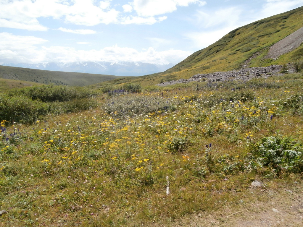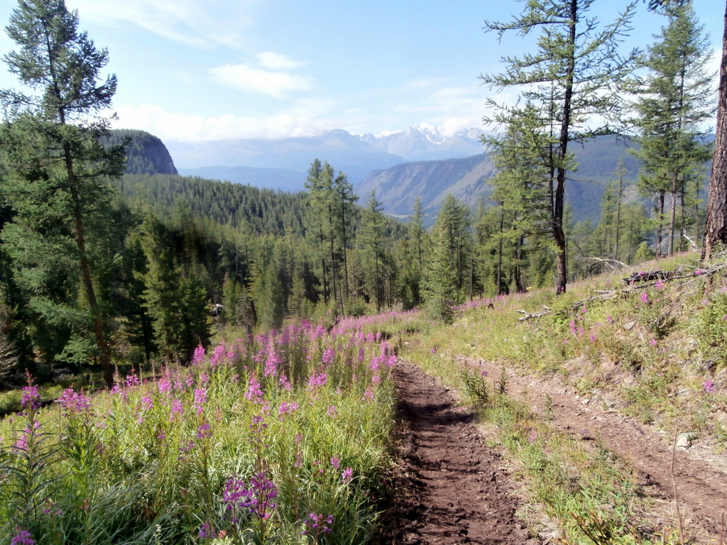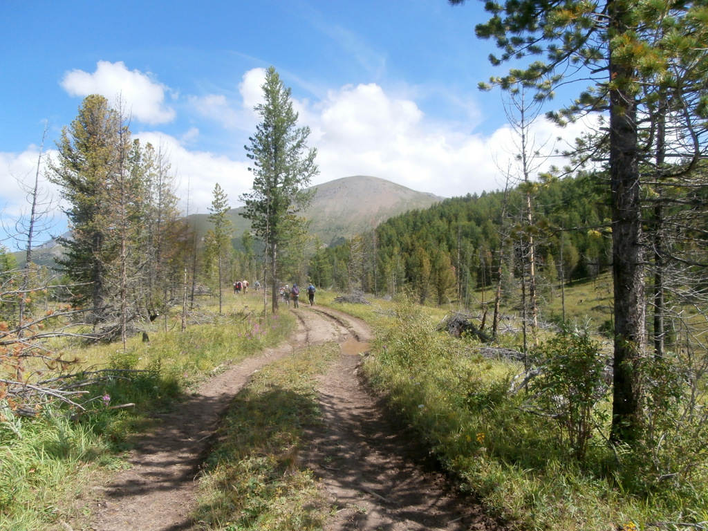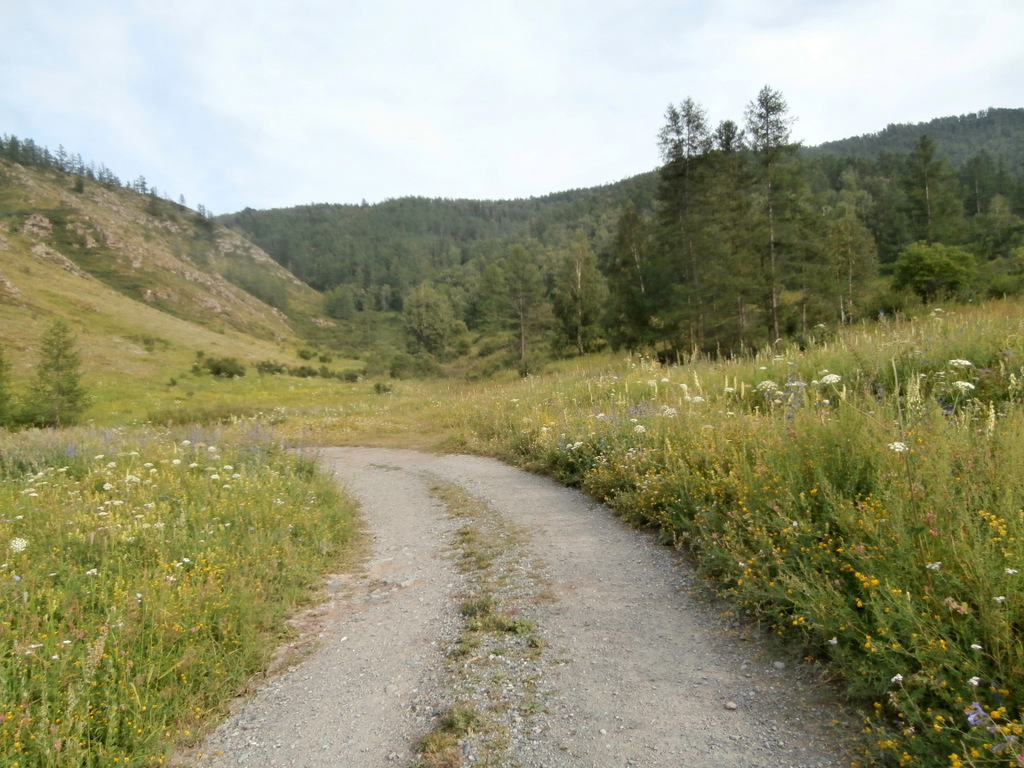Проехали километров 20 на восток по Чуйскому тракту и вышли прямо в поле рядом с шоссе. Здесь проходит старая дорога, и по ней мы пошли на перевал Чике-Таман. Так я хлебнула первый глоток природы Алтая. Впоследствии будут маршруты более крутые и более впечатляющие, но этот был первый, и я шла и наслаждалась, любуясь цветущими лугами, лесом и горами.