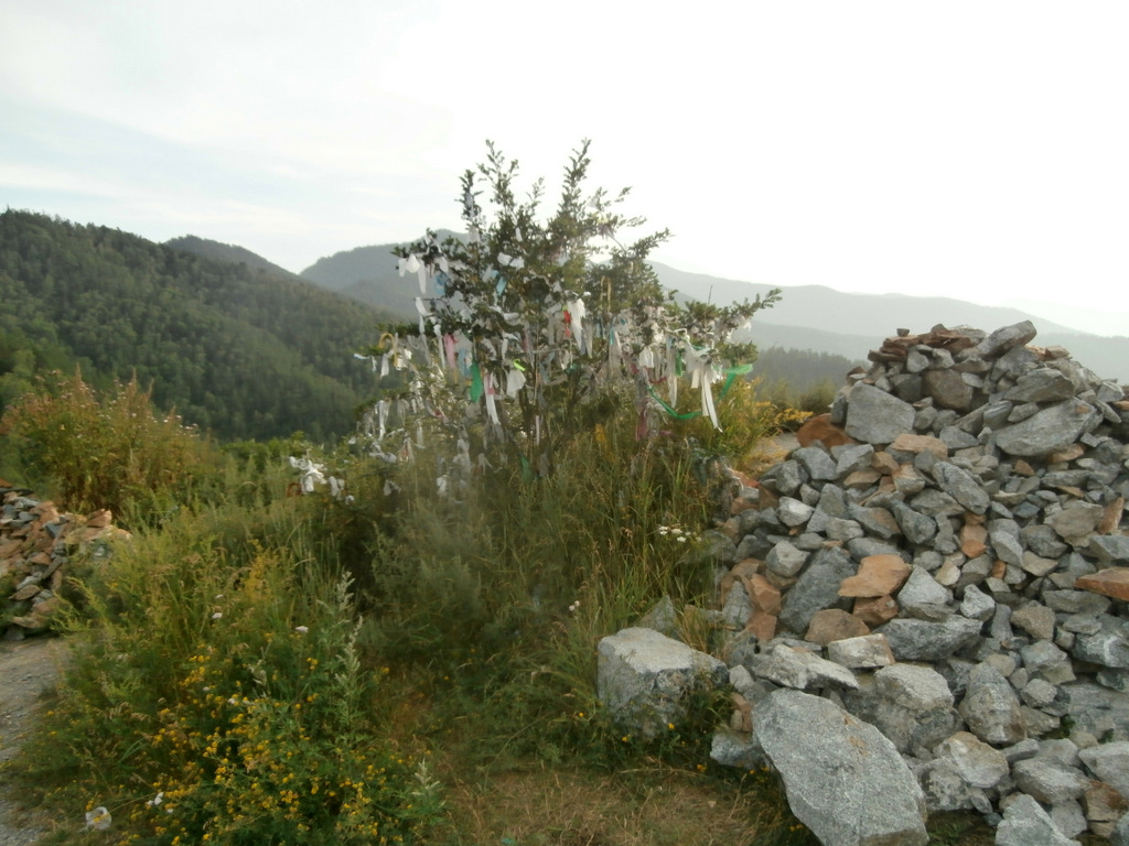 Мы поднялись на перевал Чике-Таман, а затем с него спустились. На вершине перевала находится смотровая площадка, откуда открываются красивые панорамы гор. Здесь же растет шаман-дерево, на которое привязывают тряпочки те, кто побывал на перевале.