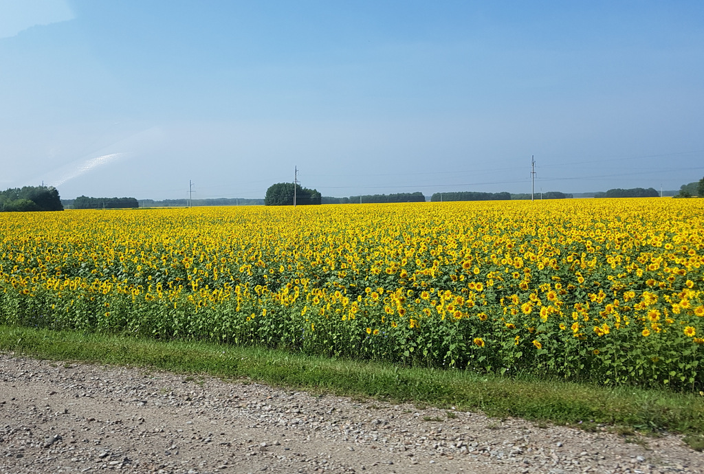 Чем дальше мы продвигались по Чуйскому тракту, тем интереснее становился пейзаж. Особенно мне понравились нескончаемые жёлтые поля подсолнухов.Вскоре мы въехали на территорию республики Алтай, столица которой город Горно-Алтайск. А до этого ехали по территории Алтайского края со столицей в Барнауле.