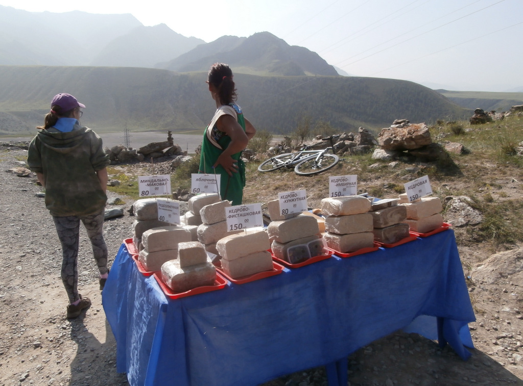 Сам перевал больше похож на большой магазин под открытым небом. Продают здесь всякую всячину. Как любитель бумажных карт, я купила себе карту Республики Алтай в масштабе 1:510000 и впоследствии часто её рассматривала.