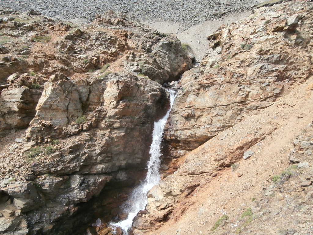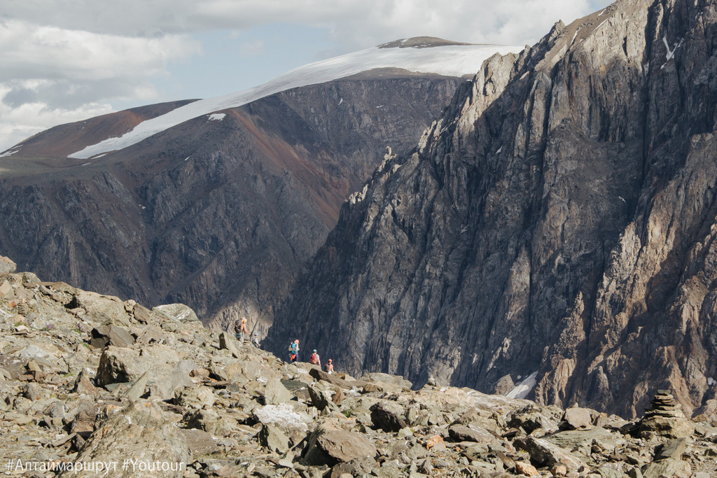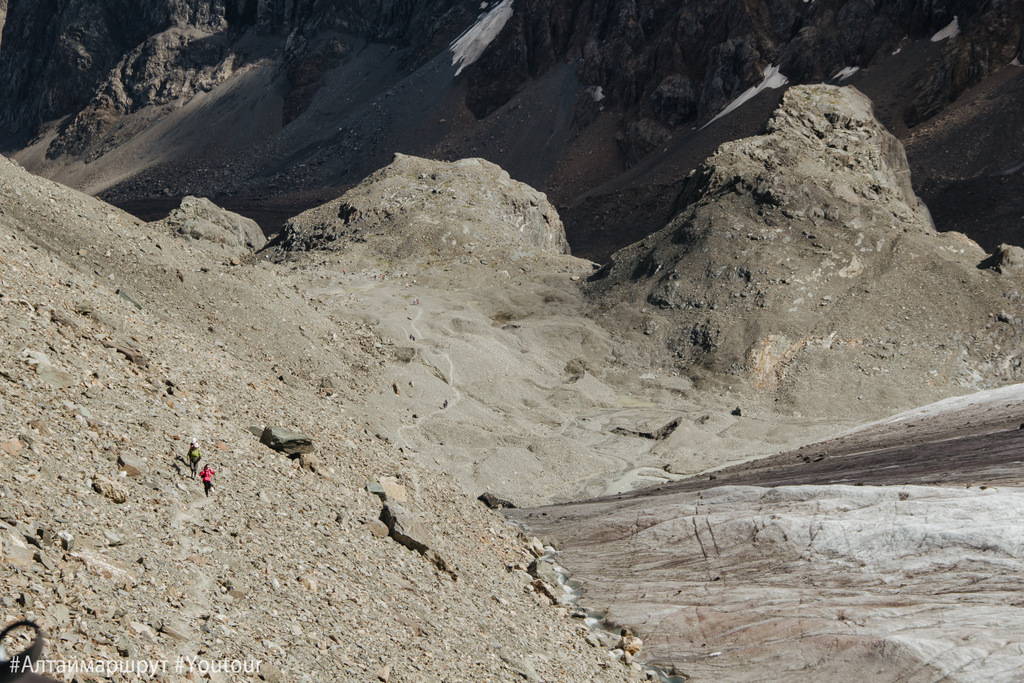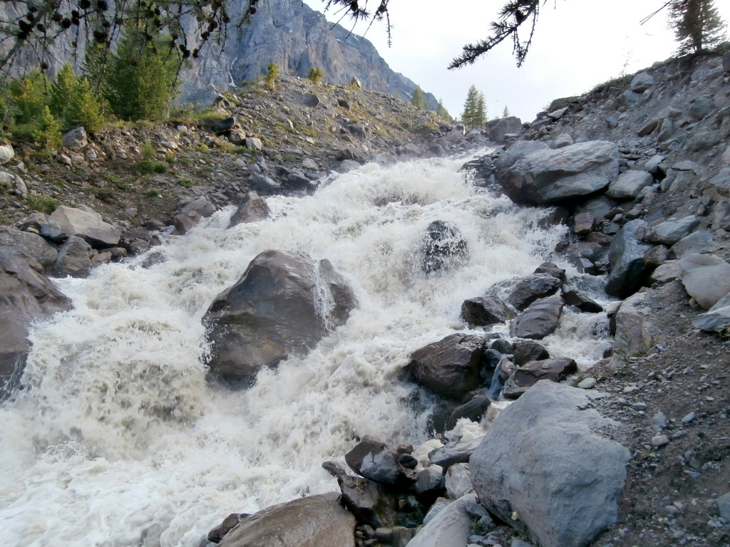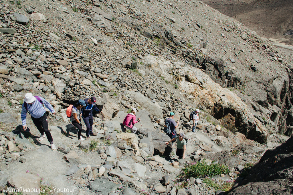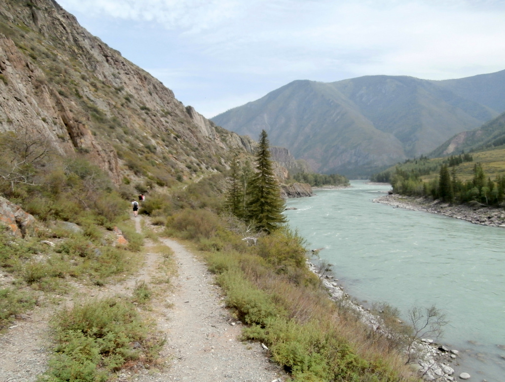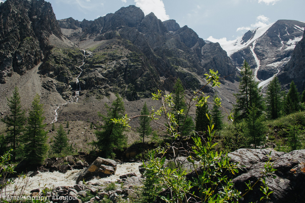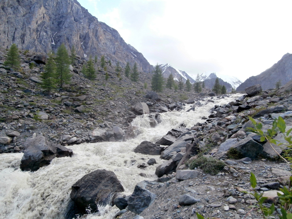 Вскоре начался подъём по каменистой тропе. Один сплошной подъём, временами крутой, временами пологий. Слева шумит бурная широкая река — это результат таяния ледника. Там же слева возвышаются горы. Виден ледник Малый Актру, видны водопады, стекающие по крутым склонам. Потрясающие картины!
