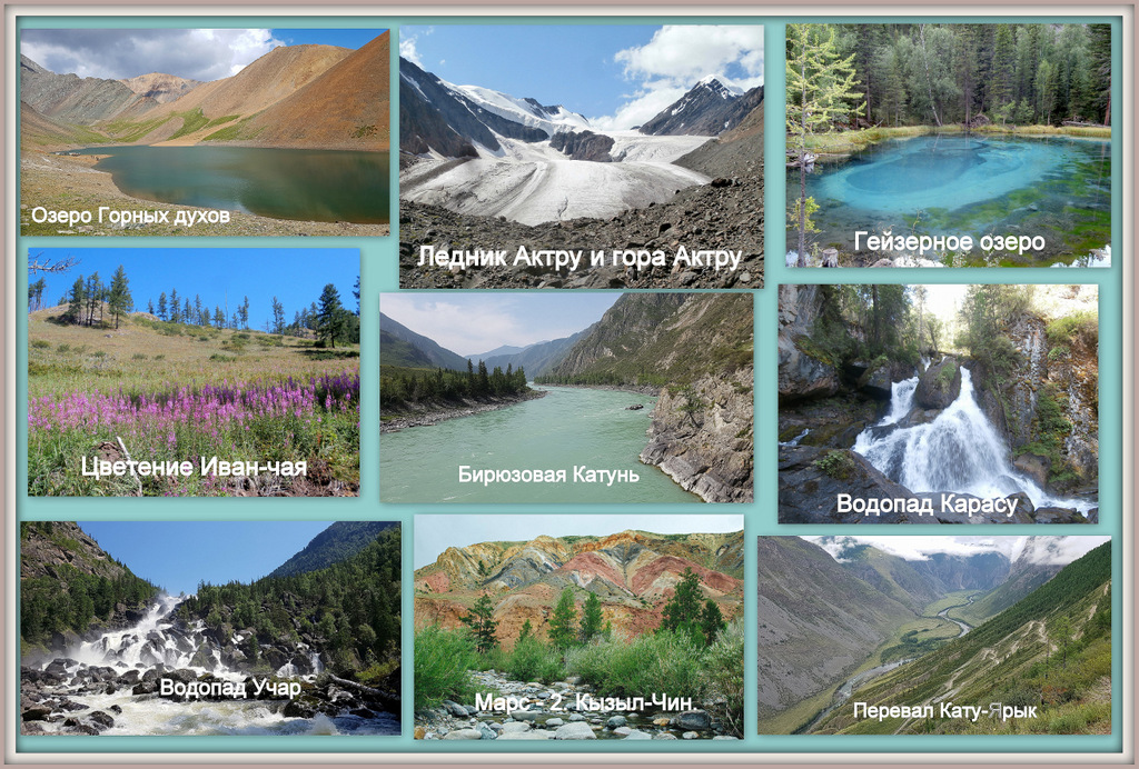 Свой отчёт я, пожалуй, начну общей фотографией избранных мест Алтая, в которых мне посчастливилось побывать. И это только малая толика Алтайских красот.