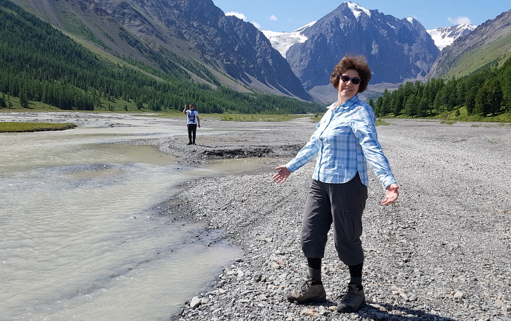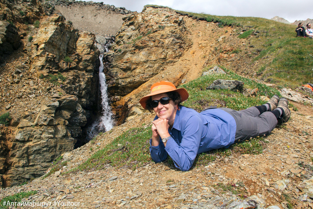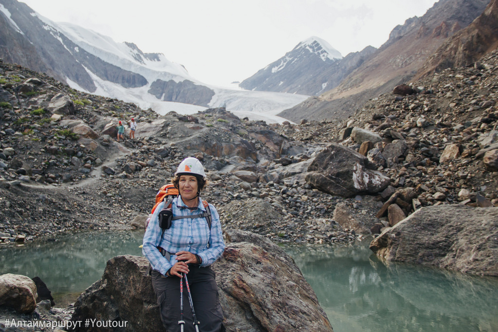 Разумеется, в этом живописном месте мы устроили фотосессию. Марго, наш доблестный фотограф, сняла меня для рекламы сайта их компании. Она хотела донести до людей, что и в таком солидном возрасте, как мой, можно пройти тур «Горные тропинки» и, в частности, подняться на ледник Актру.
