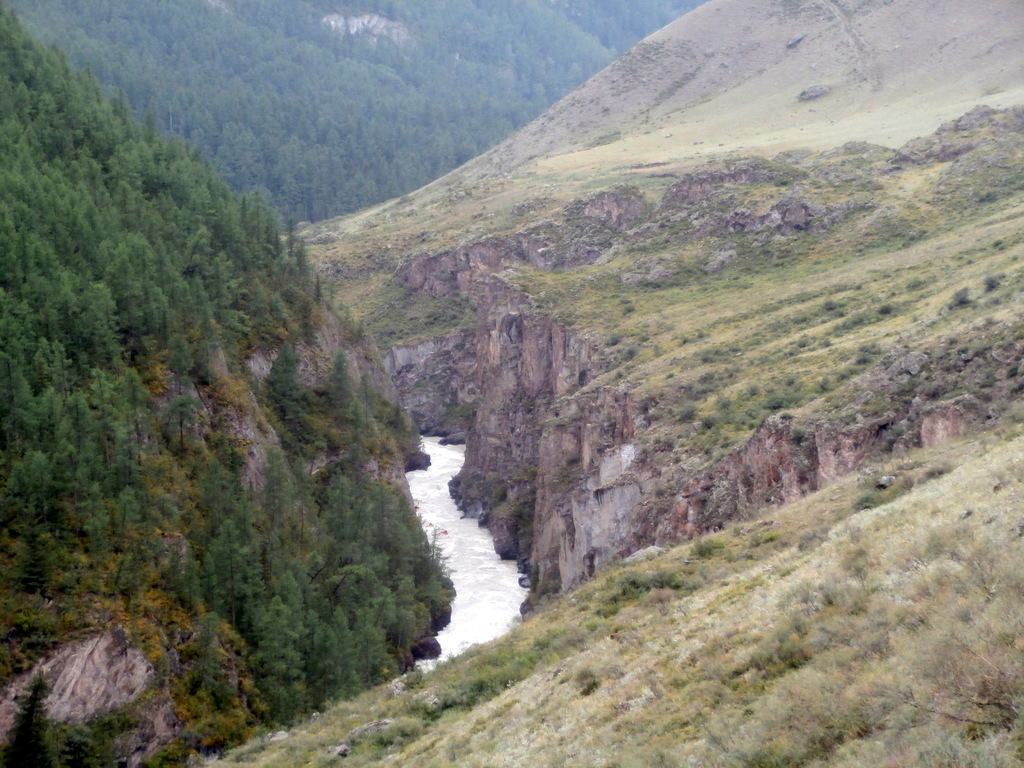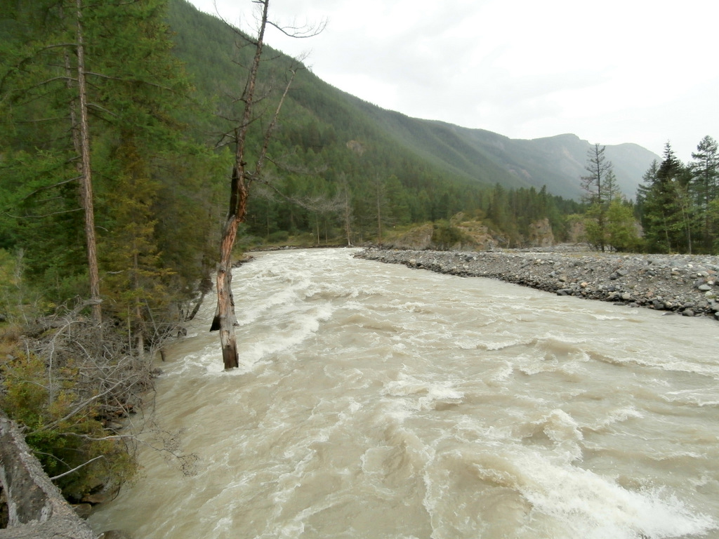 После Перевалки началась дорога, что называется «туши свет» или «мама не горюй». Ехали среди густого девственного леса. Рядом течёт бурная горная река Актру. Её мы перезжали прямо по воде.