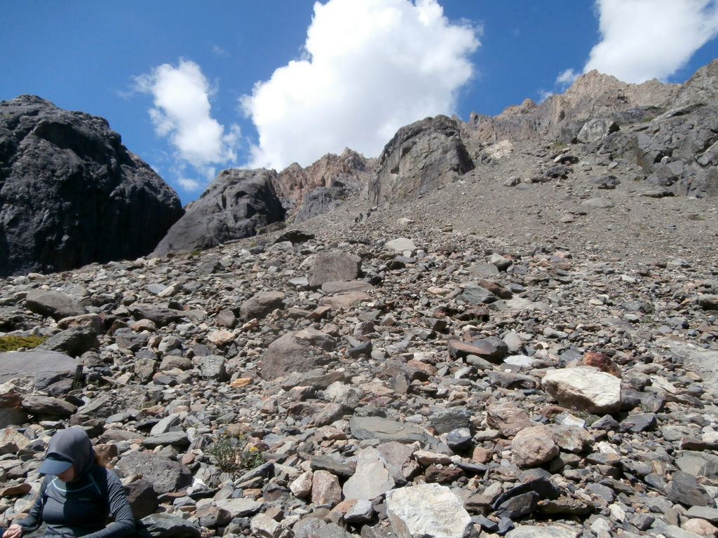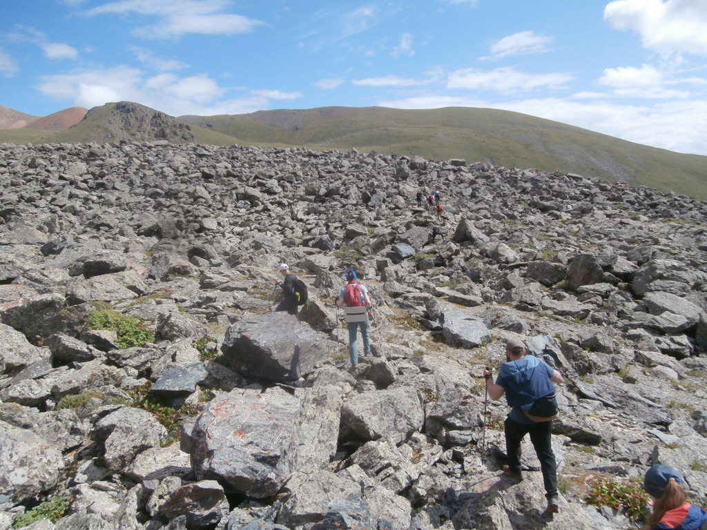Далее был переход через  курумник, по нашему — болдеринг. Здесь я многих обогнала, хоть они и в два раза моложе меня. Сказался богатый опыт хождения по болдерам в наших израильских пустынях. А некоторые люди из нашей группы видели курумник впервые в жизни.